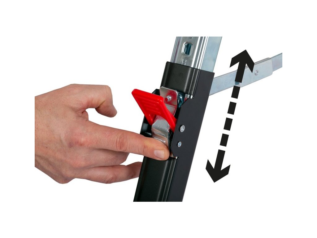 - nosná plocha s protikluznou vrstvou, na jedné straně noh výklopné opěrky pro OSB desky, lamino, apod. s nosností 30 kg na jednu opěrku