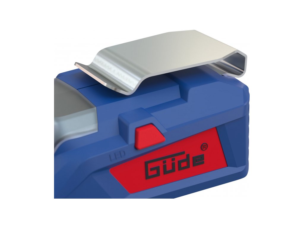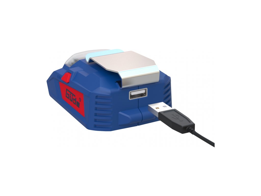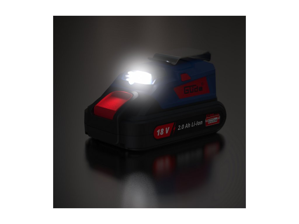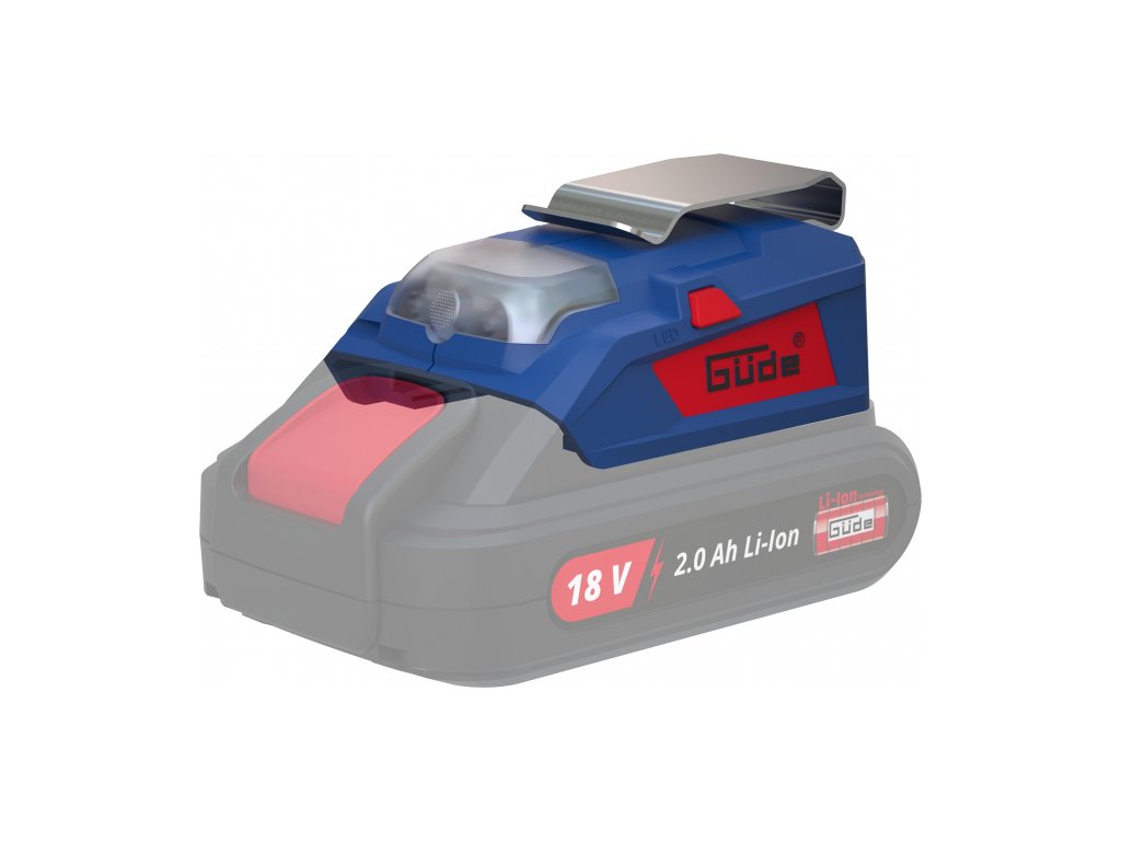 Pro akumulátory 18 V, nabíjecí proud 1,5 A, výstupní napětí 5 V, LED svítilna.