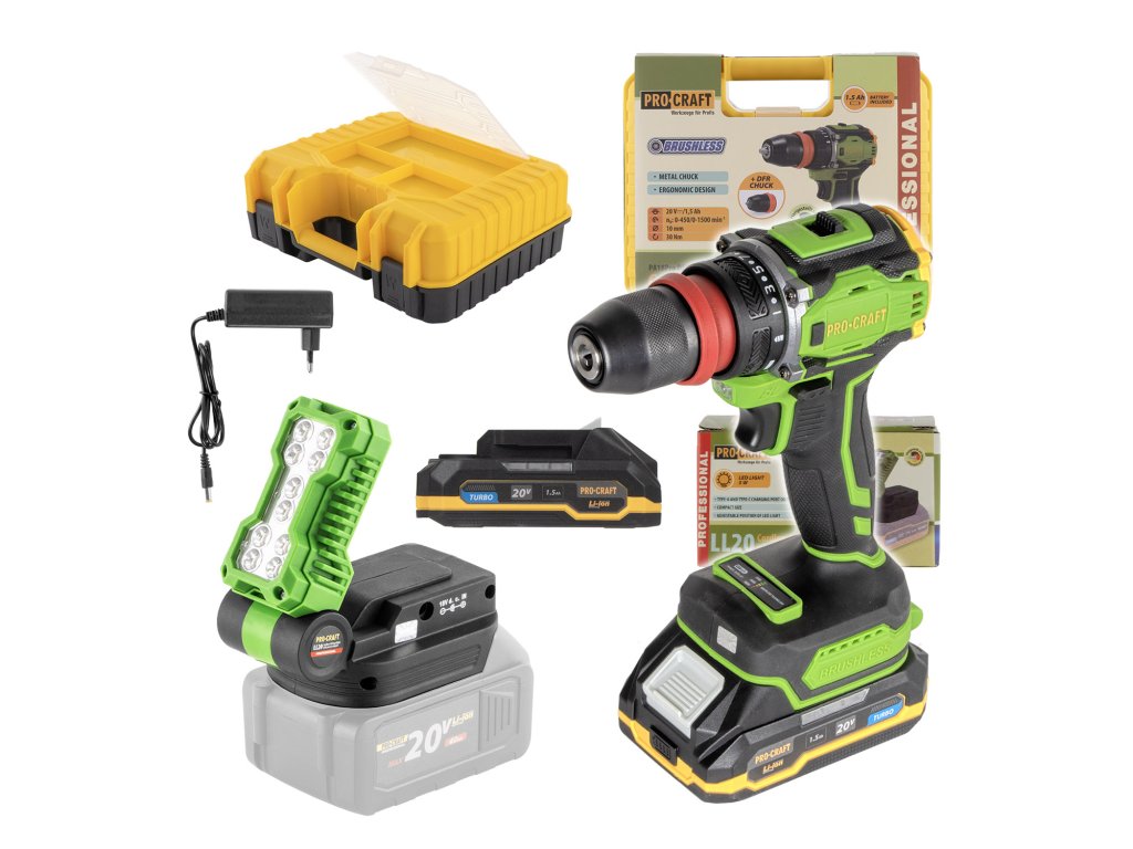 Aku šroubovák Procraft PA18Pro s odnímatelným rychloupínacím sklíčidlem, kroutícím momentem 30 Nm a otáčkami 0–450/0–1500 min⁻¹. Vybaven LED reflektorem LL20bb. Součástí je kufr, baterie 20V 1,5Ah a nabíječka. Ideální pro vrtání i šroubování.