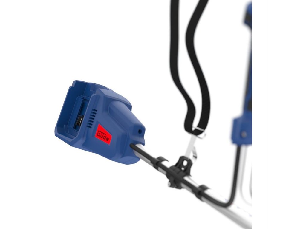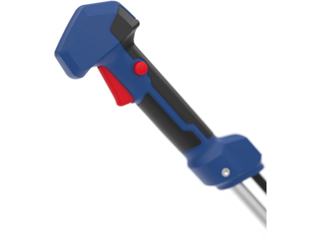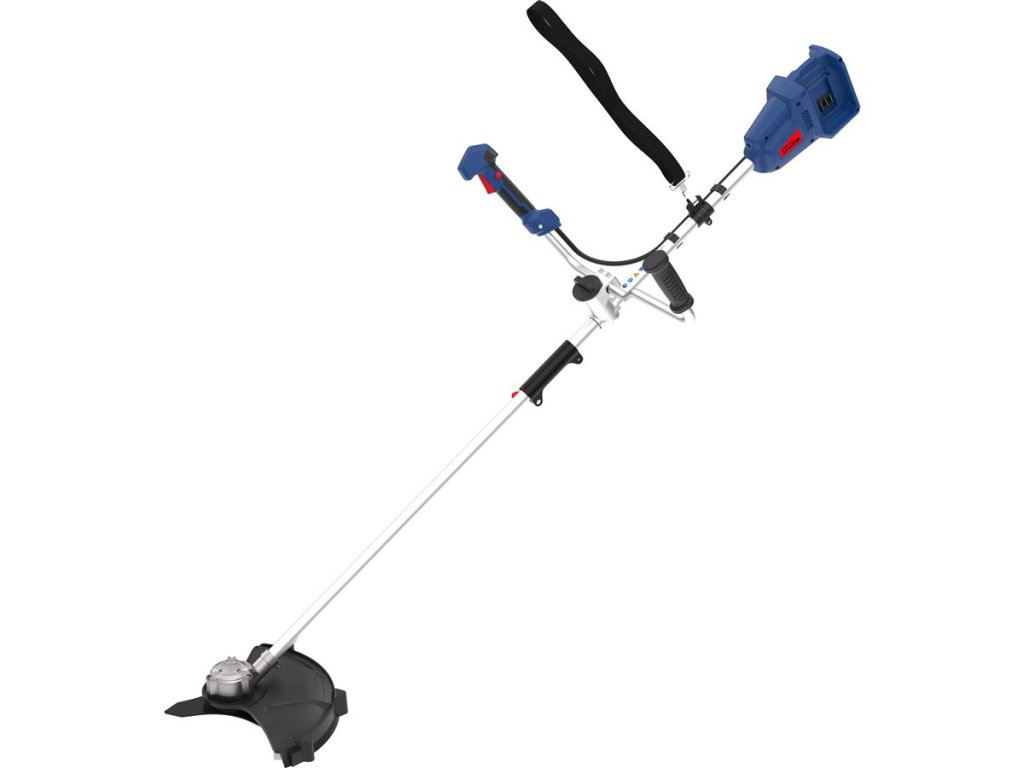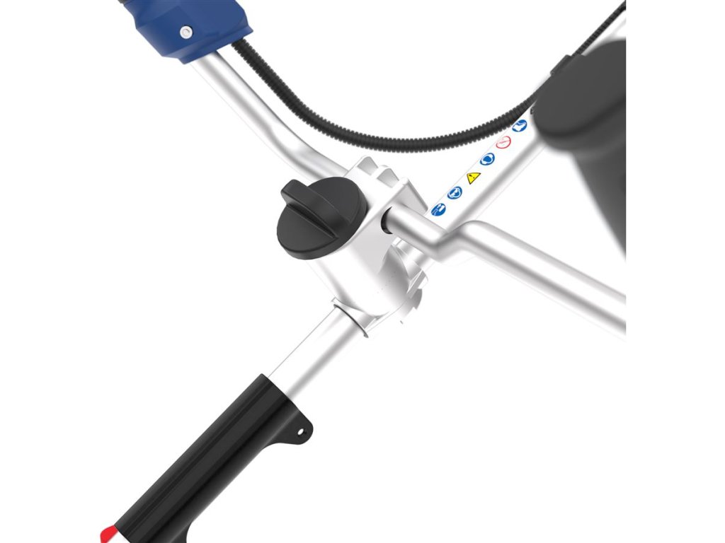 Konstrukce: rozdělitelná (2dílná) hnací hřídel, ergonomicky tvarované ovládací rukojeti, robustní ochranný kryt, ramenní popruh.