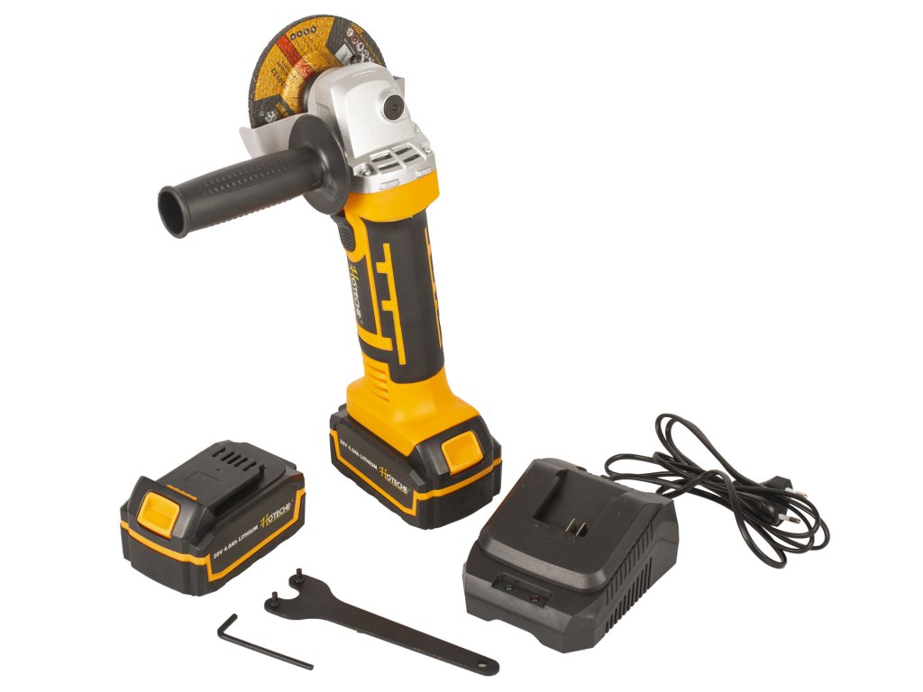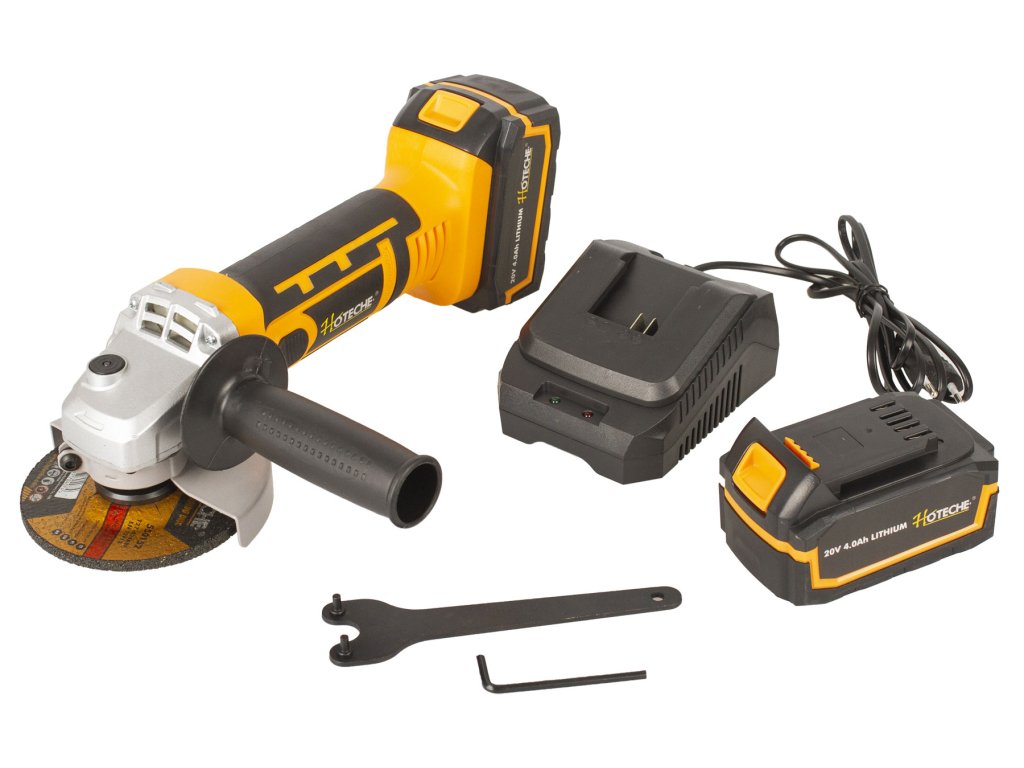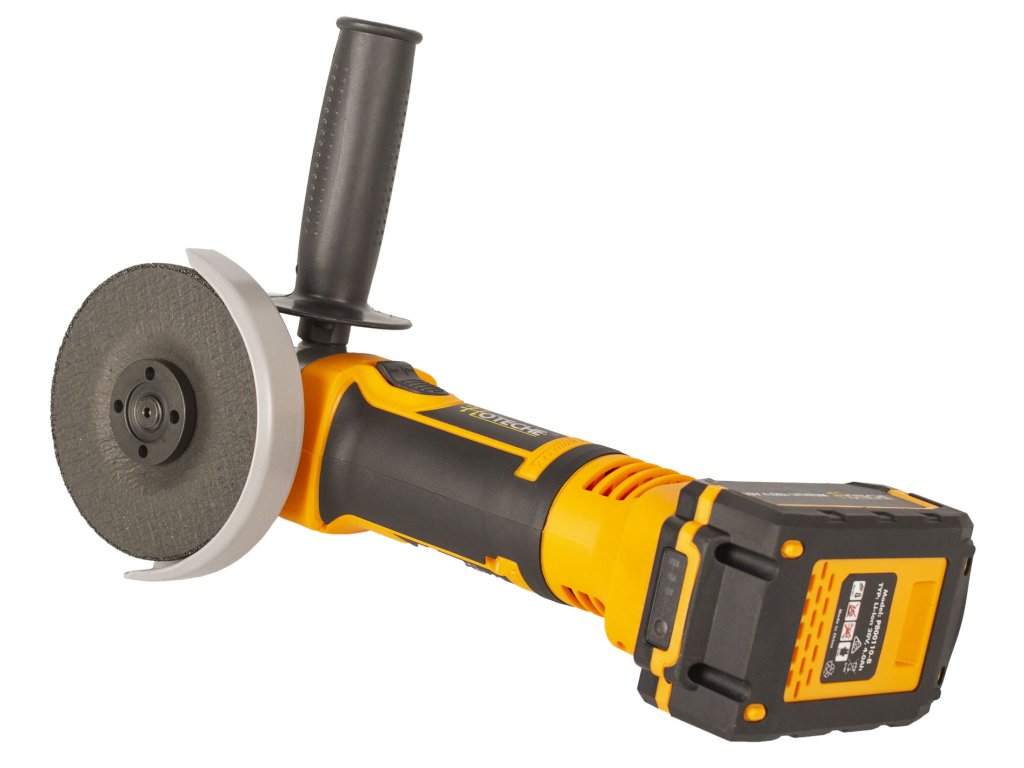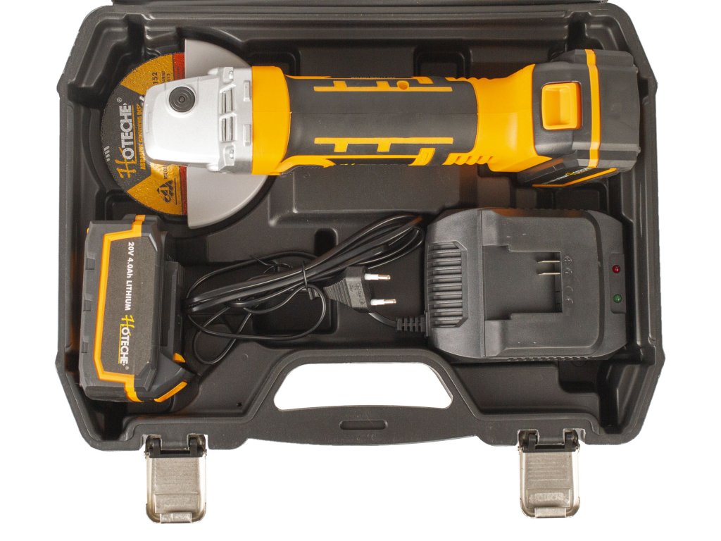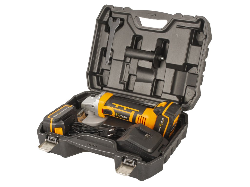 Kompaktní AKU úhlová bruska od značky Hoteche s výkonným motorem, který je schopen dosáhnout ve volnoběžných otáčkách až 8000 za minutu.