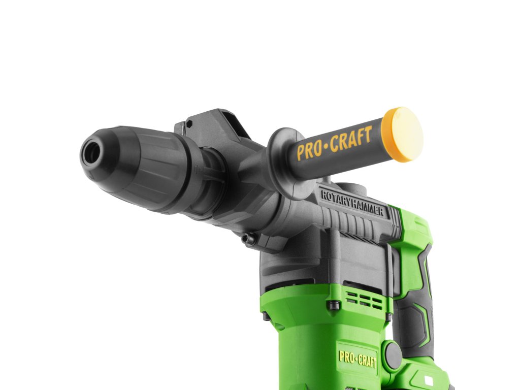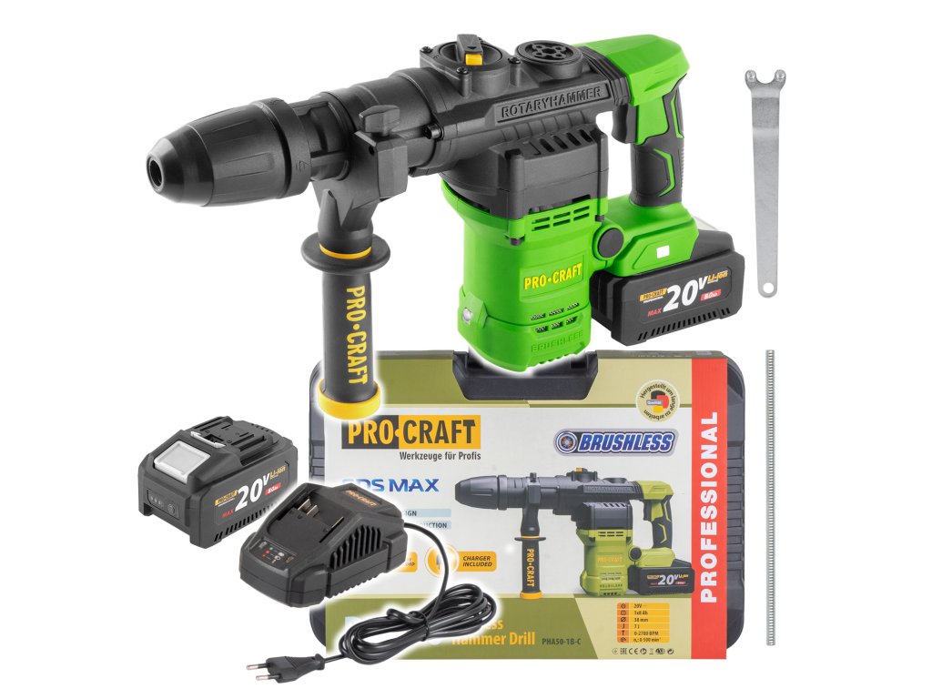 Aku vrtací kladivo Procraft PHA50-1b-c s bezuhlíkovým motorem. Režimy vrtání s příklepem a sekání, síla úderu 7 J, otáčky 0–500/min⁻¹ , příklepy 0–2700/min⁻¹ . Ideální pro stavební a renovace práce. Součástí balení je baterie, nabíječka a kufr.