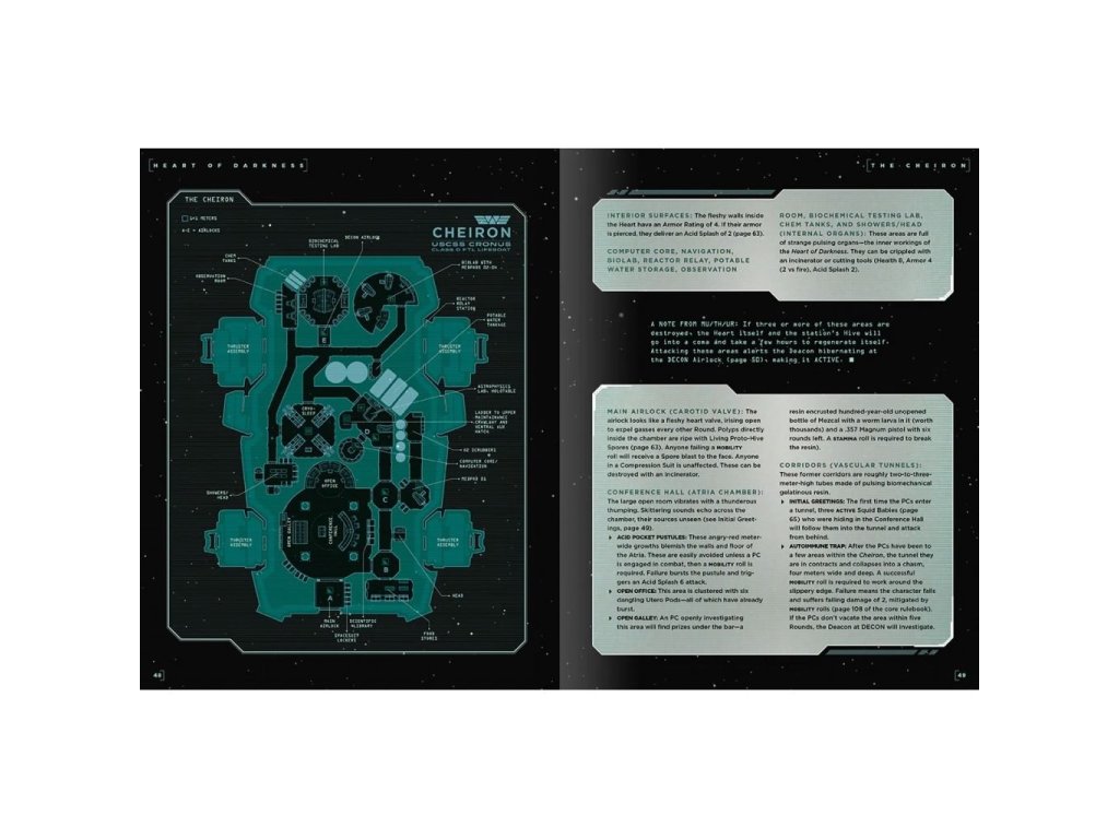 Uvnitř krabice se sadou Heart of Darkness naleznete herní scénář, mapy a dalším materiál pro hru na hrdiny Alien RPG. Sada je v angličtině, je k ní zapotřebí vlastnit základní pravidla nebo Starter Set. The company found a new lifeform, and they want you to study it. Their offer’s uncharacteristically generous - you catalog this organism, determine how they can use it, and bring it back so they can slap their patent on it. Fairly routine stuff. In exchange, they ll hook you up with a cushy corporate department head position, secure you a book deal, and make sure the institute of your choice gives you tenure. Did I mention the money? There’s a lot of it. Simple survey, sample, and analysis job. Seemed too good to be true. Of course it is. Heart of Darkness is a complete Cinematic Scenario for the ALIEN roleplaying game, written by sci-fi novelist Andrew E.C. Gaska. It is a stand-alone adventure, but also serves as a conclusion to the Draconis Strain Saga begun in the cinematic scenario Chariot of the Gods and continued in Destroyer of Worlds. The scenario is designed for 3–5 players plus the Game Mother, and is a spiraling descent into soul-crushing madness. This boxed set contains: The main Heart of Darkness scenario book. A huge double-sided map (format 864 x 558 mm) of the Erebos plasma trawling space station. Seven pre-generated characters to choose from. Custom cards for secret messages and personal agendas. Player maps and handouts. Requiers the core rulebook to be played.