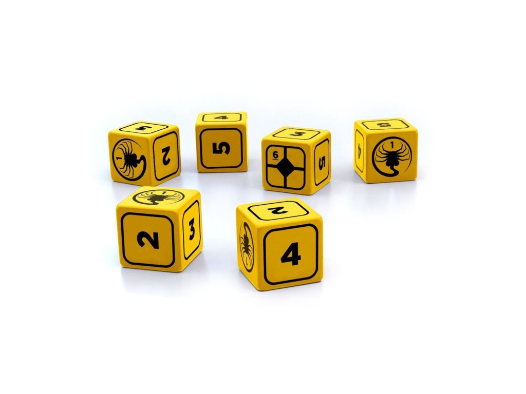 Sada šestistěnných kostek pro hru na hrdiny Alien RPG ze světa Vetřelce. Kostky jsou ryté a mají průměr 16 mm.