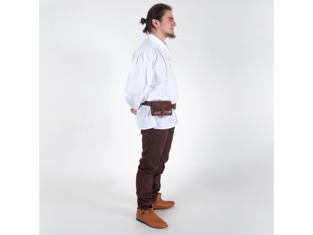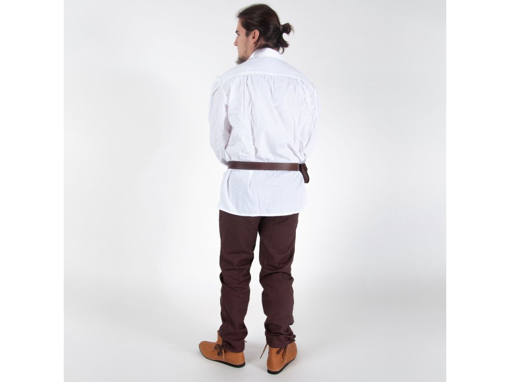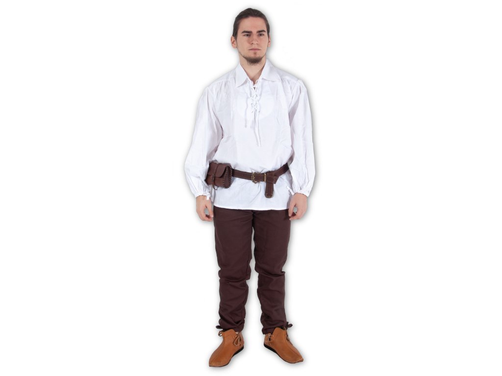 Kvalitní bílá košile z bavlněného plátna volnějšího střihu s límečkem a šněrováním u krku. Šněrování je opatřeno kovovými dírkami, rukávy jsou dlouhé, u zápěstí stahovací na šňůrku. Výtečný základ kostýmu na dřevárnu či larp. Více o použitém materiálu se dočtete zde: popis materiálů.