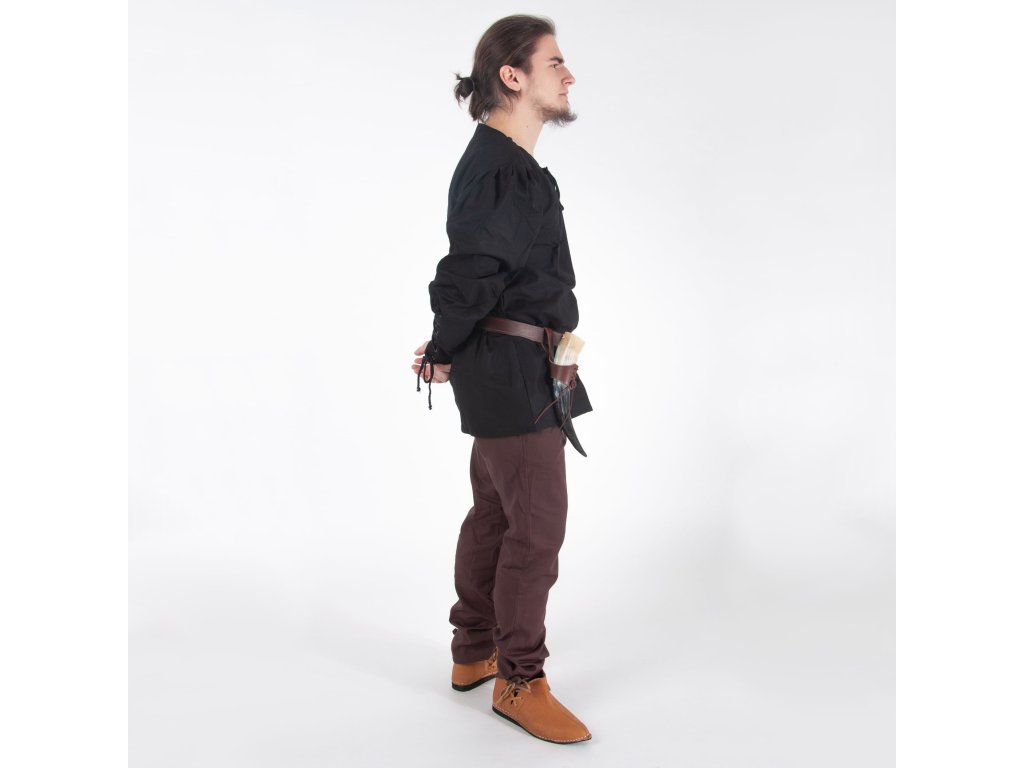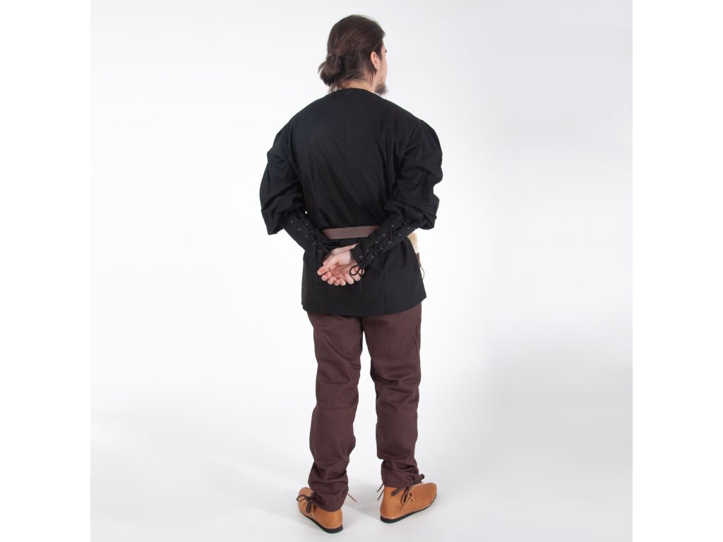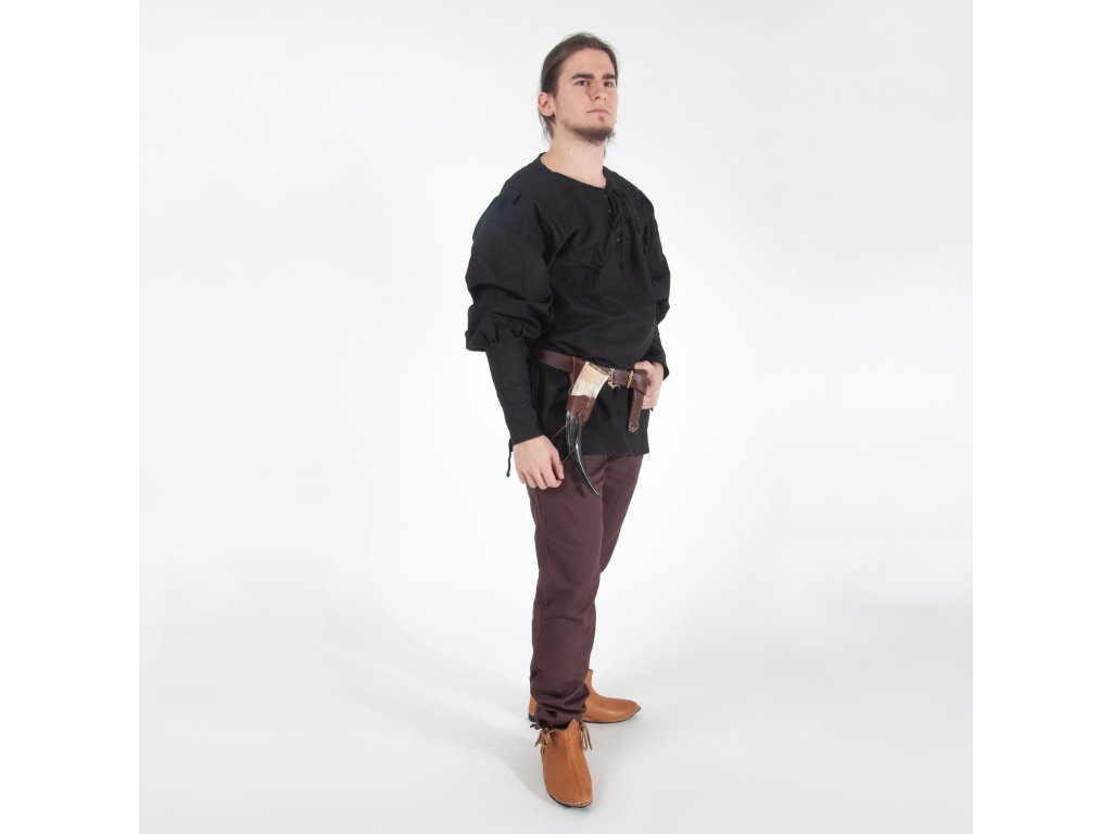 Černá pánská plátěná košile je tím ideálním základem pro fantasy či historický kostým nebo na LARP. Ať už se chystáte pět písně jako okouzlující bard nebo brousíte svůj meč do boje, v naší pánské košili budete vždy nepřehlédnutelný. Košile je příjemně vzdušná a má šněrování u krku i na rukávech, které jsou zúžené. Pánská košile byla ušita v naší krejčovské dílně ze 100% bavlněného plátna. Košili pro vás šijeme také v dalších barvách: hnědá, zelená a bílá. Pokud si chcete přečíst více o použitém materiálu, mrkněte zde: popis materiálů.