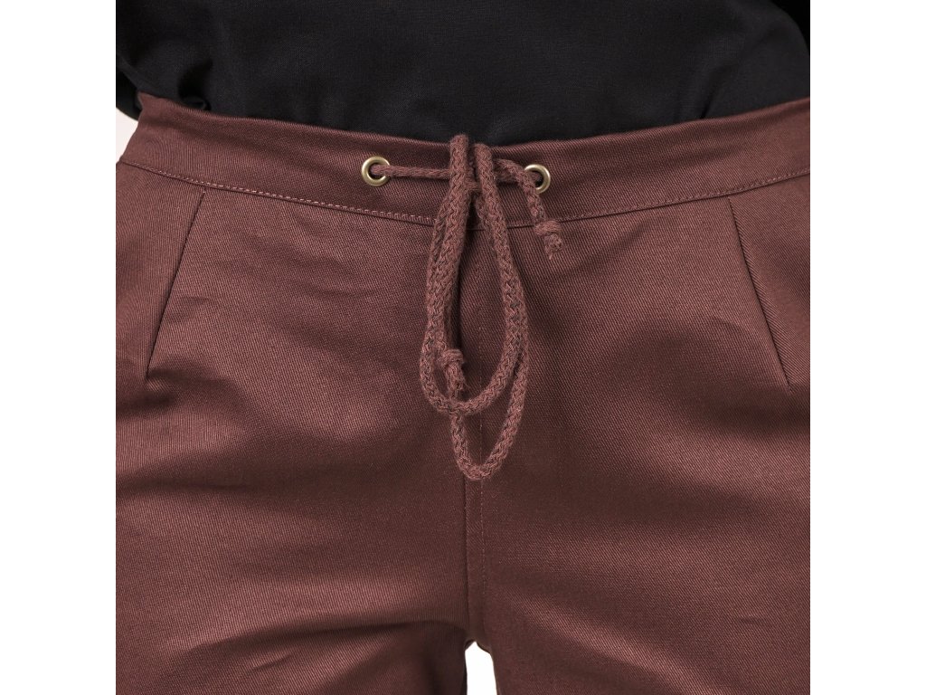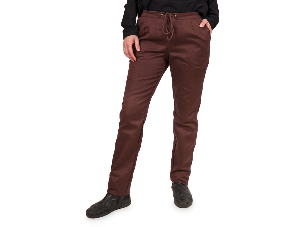 Dámské bavlněné kalhoty rovného střihu oceníte jako doplněk pro každý kostým na LARP, pokud hledáte alternativu místo sukně či šatů. Kalhoty jsou ušity z kvalitního a pevného bavlněného plátna keprové vazby (245 g/m²). Dvě praktické kapsy jsou samozřejmostí. Vejde se do nich jak pár zlaťáků, tak i nějaký ten kapesníček pro případného nápadníka. Jednoduchost a pohodlný střih kalhot oceníte nejen pro LARP, ale také při běžném nošení. V nabídce máme kalhoty také v černé barvě. Kalhoty se utahují v pase pomocí šňůrky a navíc je zadní díl opatřen gumou, aby se kalhoty perfektně přizpůsobily každé krásné postavě. Pokud chcete svůj pas vystavit více na obdiv, mrkněte na naši nabídku kožených opasků. Podle potřeby jsme schopni jejich délku upravit na vaši míru. Nezapomeňte si pořídit ke kalhotám i nějakou bavlněnou blůzu či halenku. Modelka na fotkách je vysoká 168 cm a má oblečené kalhoty vel. S.