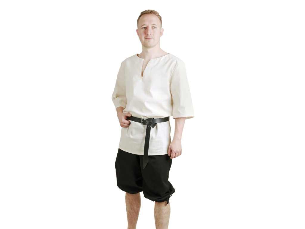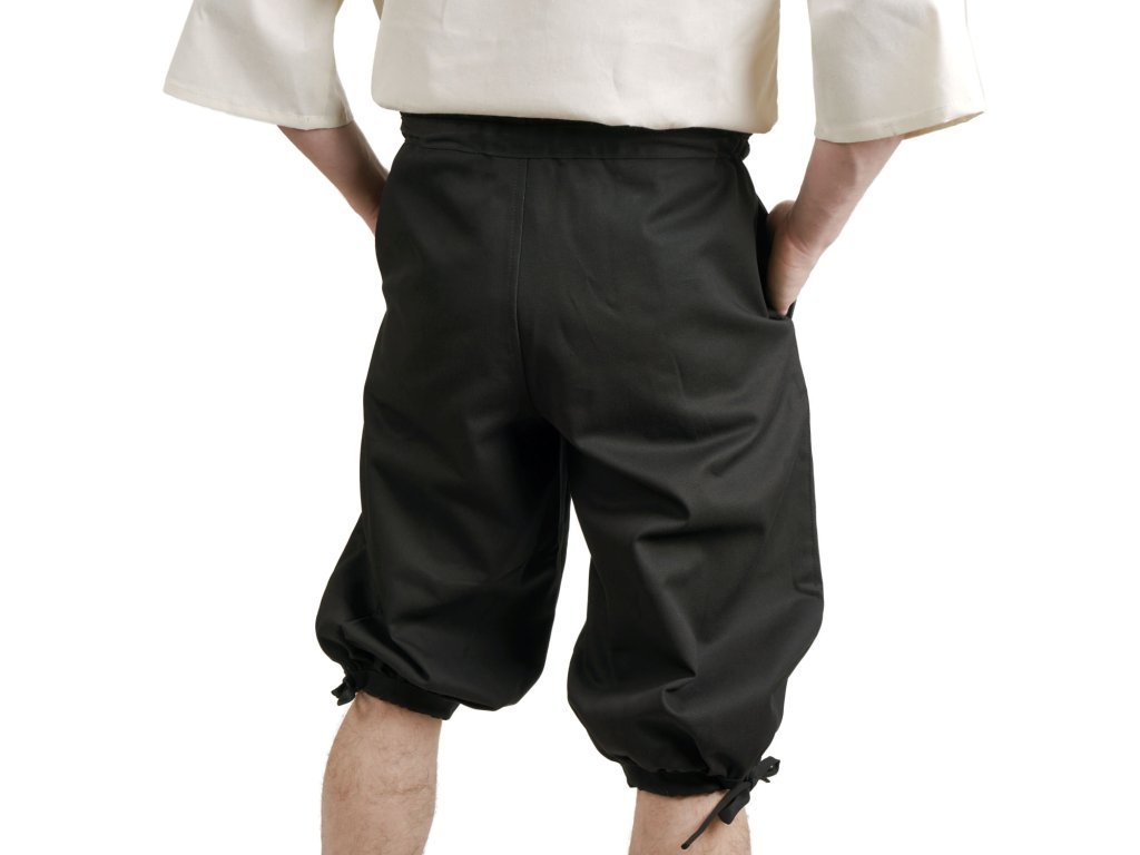 Krátké bavlněné kalhoty pod kolena, opatřené šňůrkou na stažení v pase a na nohavicích, po bocích mají dvě klasické kapsy. Ideální do teplého počasí nebo třeba jako jezdecké kalhoty. Stylové kalhoty jsou univerzální a hodí se k historickému i steampunkovému kostýmu. Kalhoty jsou z pevné bavlněné látky (kepr), šijeme je také v hnědé barvě.