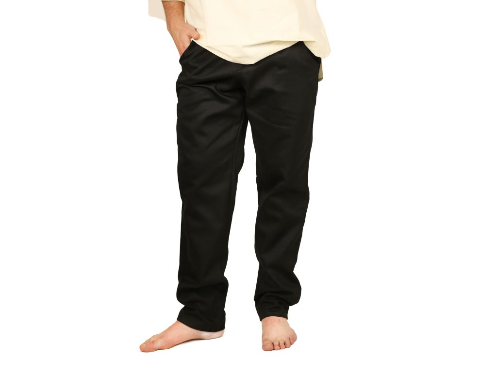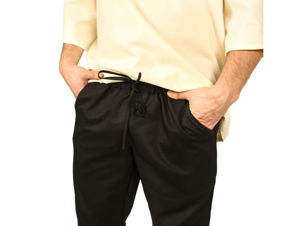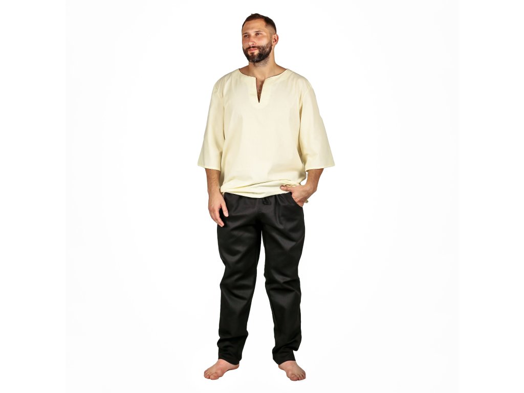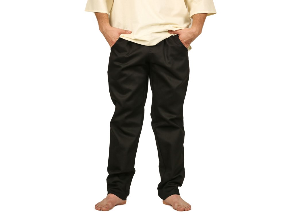 Jednoduché černé kalhoty vám poslouží jako perfektní součást téměř každého kostýmu. Jsou vyrobeny z kvalitní bavlny a díky volnému střihu se v nich budete cítit pohodlně i po celodenní práci na poli nebo obraně středověkého hradiště. Navíc mají praktické kapsy, do kterých můžete schovat drobné předměty nebo mince. Ale pozor na kapsáře! Díky jejich dobovému vzhledu je můžete využít pro různé příležitosti. Uděláte v nich dojem na dřevárně, historickém jarmarku nebo fantasy larpu. Můžete si je také pořídit v klasické hnědé barvě. Kalhoty mají sice v pase stáhnete šňůrkou, ale pro stylovější vzhled můžete kostým vylepšit některým z našich kožených opasků. Pořiďte si ke kalhotám i bavlněnou fantasy košili.