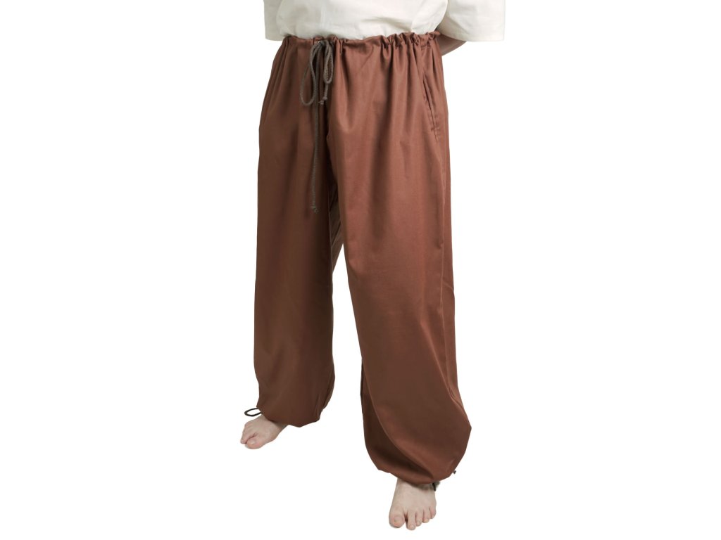 Široké hnědé kalhoty využijete jako skvělou součást fantasy nebo historického kostýmu. Stylové kalhoty jsou ušité z kvalitního bavlněného plátna a díky volnému střihu se v nich budete cítit pohodlně při pobíhání v lese, divokém nájezdu i divoké oslavě v hostinci. Navíc mají vnitřní všitou kapsu na drobnosti se zapínáním na zip. Díky šněrování kolem pasu a na nohavicích si kalhoty vždy snadno utáhnete nebo uvolníte tak, byste se v nich cítili příjemně. Uděláte s nimi skvělý dojem na maškarním plese, historické bitvě nebo fantasy LARPu. Můžete si je také pořídit v elegantní černé barvě. Pro doplnění stylového vzhledu doporučujeme kalhoty doplnit fantasy košilí nebo tunikou z našeho výběru. A pokud neplánujete do bitvy vyrazit na boso, určitě oceníte i naši nabídku historické obuvi.