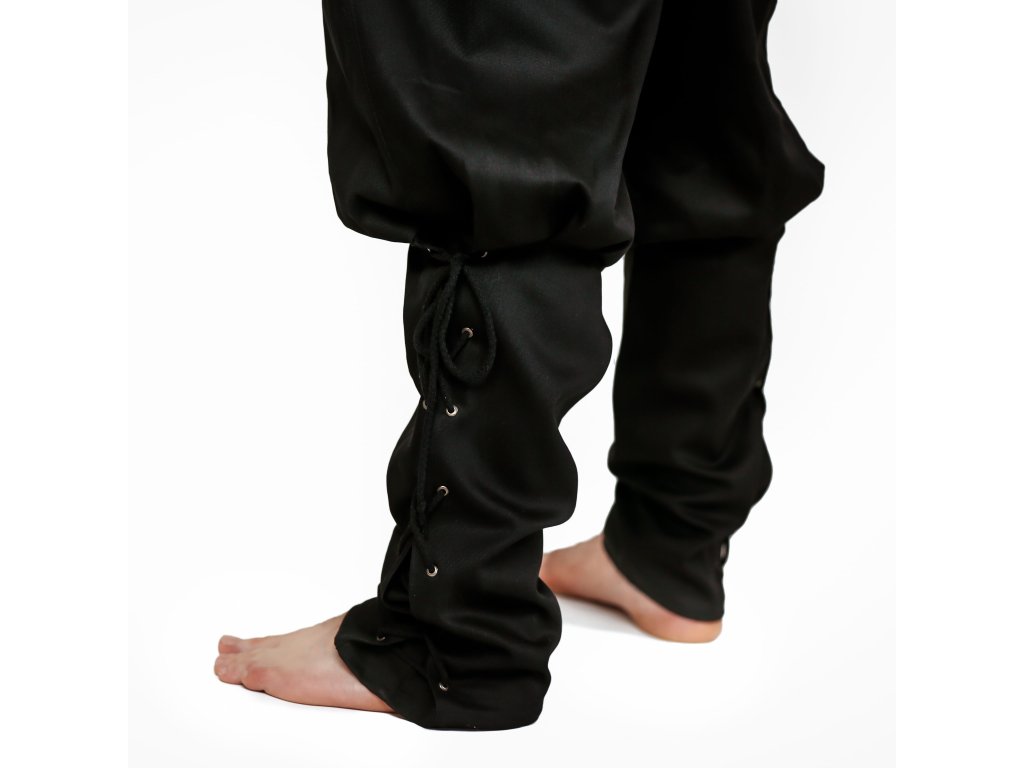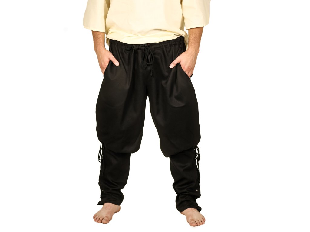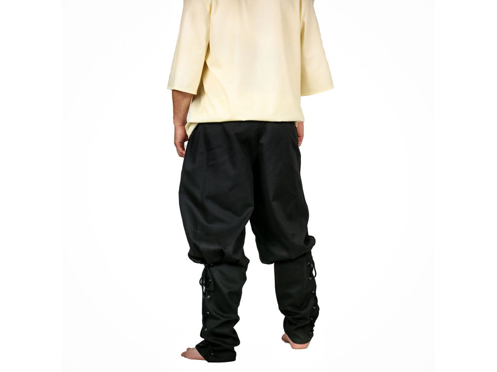 Konečně pohodlné kalhoty pro každou příležitost! Stylové černé kalhoty se širokým pasem jsou ušité z prvotřídní bavlny. Díky kvalitnímu materiálu se v nich budete vždy cítit příjemně po náročném dni na poli i na bojišti. Zúžené nohavice si můžete šněrováním utáhnout tak, aby vám perfektně seděly. Navíc mají kalhoty dvě prostorné kapsy. Díky jejich charakteristickému vzhledu poslouží jako skvělý základ historického nebo fantasy kostýmu. Využijete je tak na dřevárnu, fantasy LARP i historický jarmark. Můžete si je pořídit i ve slušivé hnědé variantě. Vytvořte si perfektní kostým a pořiďte si ke kalhotám i koženou vestu z naší nabídky. Blíží se zima? Radši nic neriskujte a zabalte se do elegantního pláště.