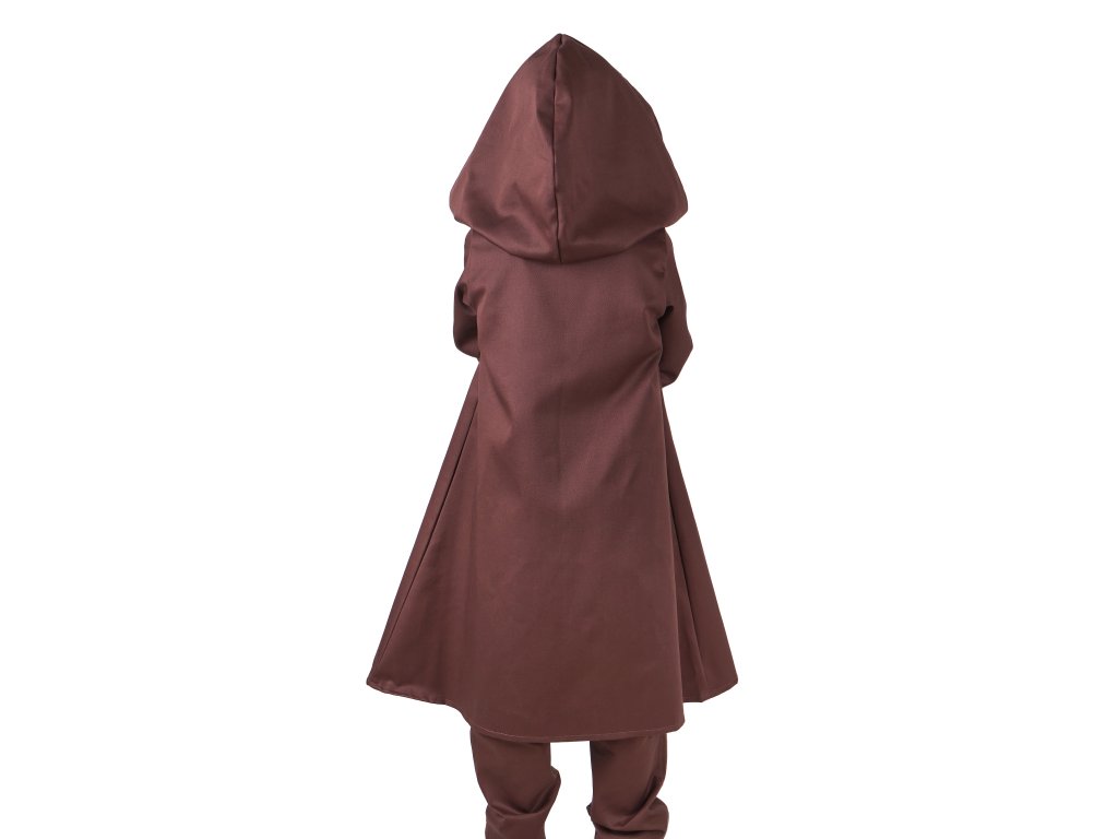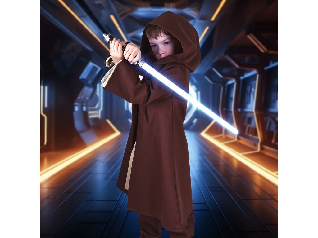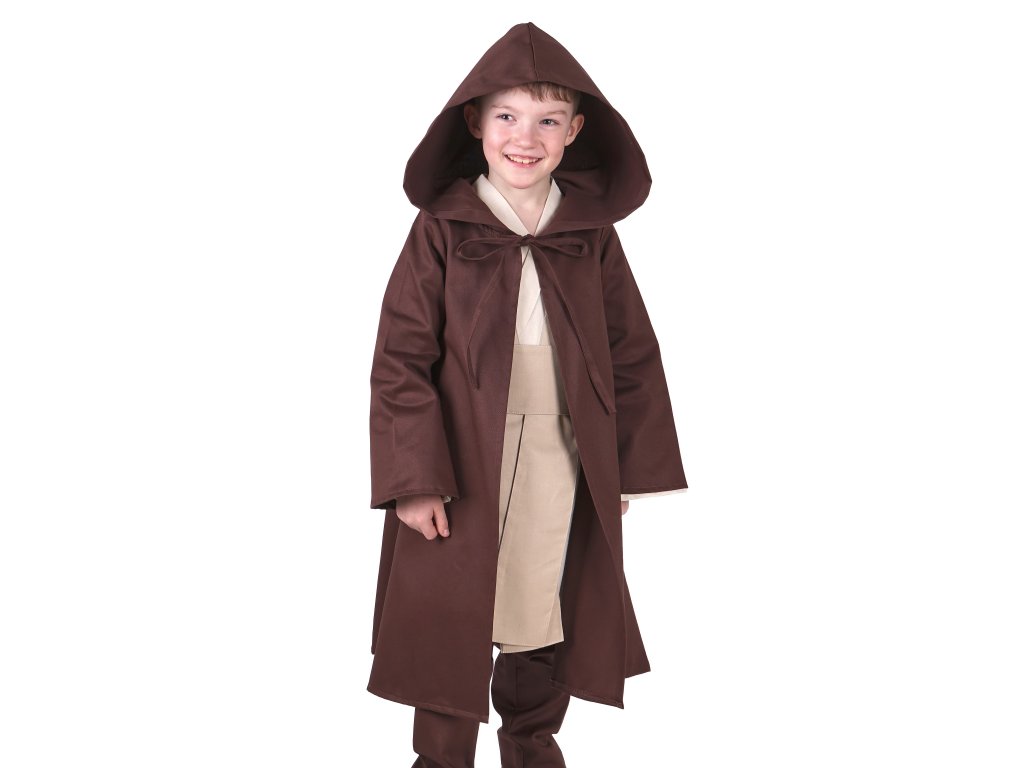 Roztomilý dětský plášť pro malé rytíře Jedi, nebo nadějné padawany tohoto řádu. Nádherný základ stejnokroje ochránců míru ve světě Hvězdných válek. Plášť ochrání před mrazivým větrem na Hothu i před žárem obou sluncí na pískem zasypané planetě Tattooine. Hnědý plášť Jedi vyrábíme v naší dílně ze 100% bavlny. Díky kvalitním materiálům je plášť pohodlný a velmi prodyšný. Plášť je rozšířený, opatřený širokou kapucí a dlouhými, širokými rukávy. K vytvoření dokonalého dojmu doporučujeme zároveň s pláštěm pořídit i dětský kostým Jedi, který můžete doplnit i hnědými kalhotami z naší nabídky. A žádnému ochránci řádu by neměl chybět jeho vlastní světelný meč.
