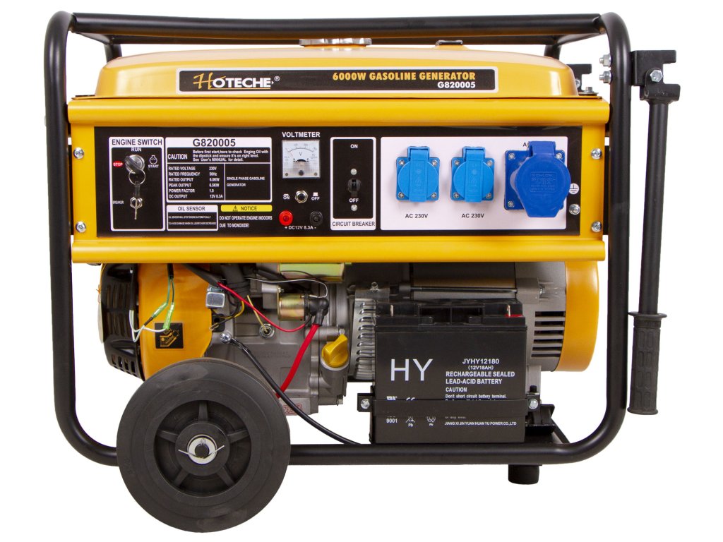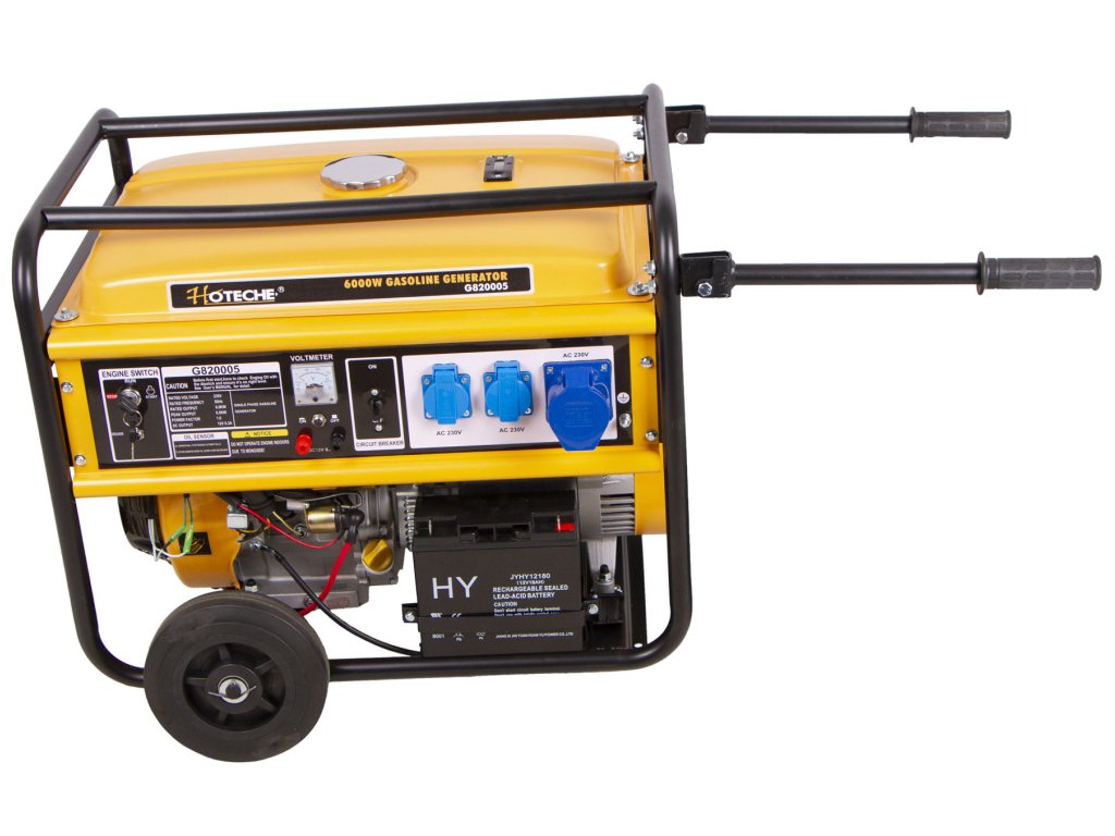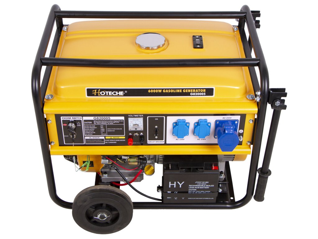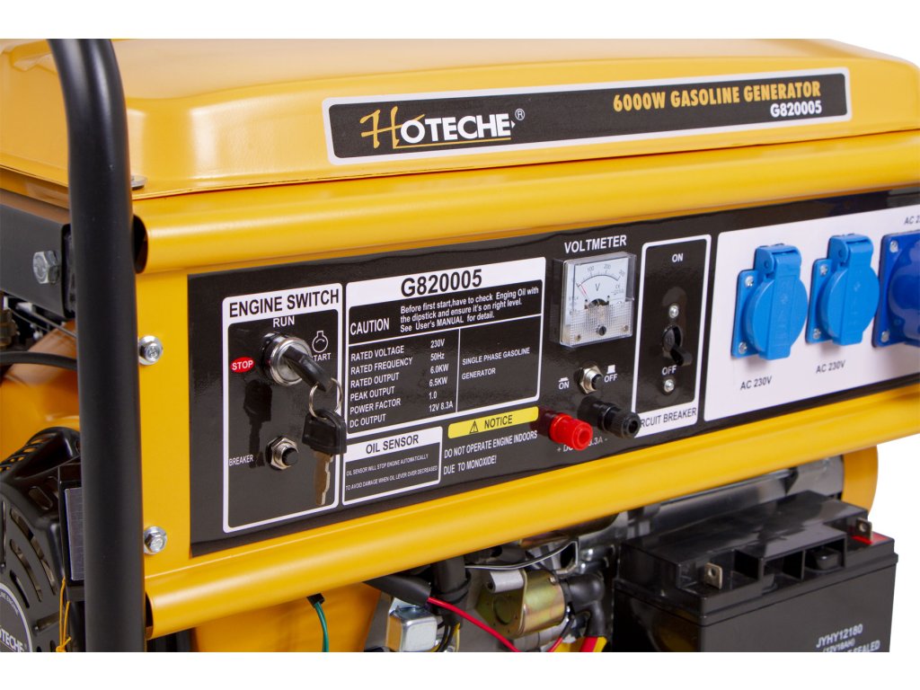 Benzínová elektrocentrála od značka Hoteche s výkonem 6000 W má jednofázový generátor elektrické energie, vzduchem chlazený, jednoválcový, 4-taktní motor, 1x výstup 12 V, 3x 230 V a voltmetr.