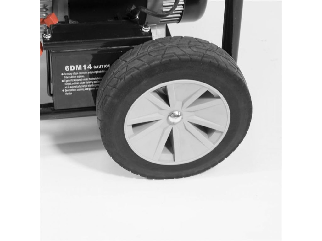 Konstrukce: přehledný ovládací panel, ochranný trubkový rám, sklopná přepravní rukojeť, velká pojezdová kola.