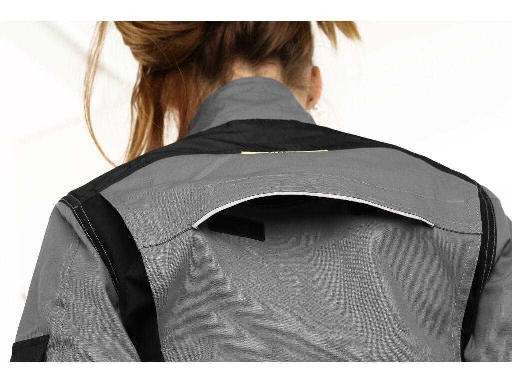 Dámská montérková blůza, strečová tkanina umožňující volný pohyb, ramena vyztužena 600D polyesterem, rukávy s pružnou manžetou, kapsička s klopou na levém rukávu, kryté zapínání na zip a druky, náprsní kapsy - na druk a zip, boční kapsy na zip, regulovatelný pas, větrání na zádech, reflexní doplňky. Doporučené použití: strojírenství, stavebnictví, lehký průmysl, automobilový průmysl, logistika, skladová manipulace, spedice, autoservisy, údržba, montáže, zemědělství, zahrada, hobby.