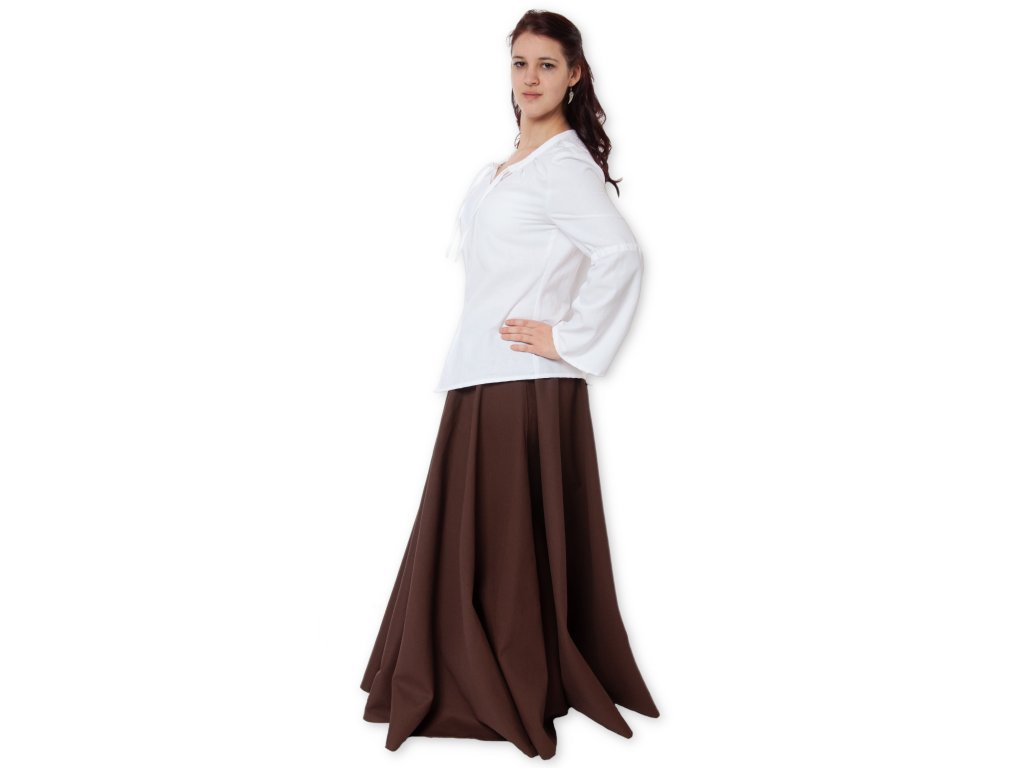 Vzdušná středověká blůza bude ideální volbou pro jednoduchý a přitom elegantní dámský kostým. Výstřih se dá upravit šňůrkou na zavázání. Dlouhé rozšířené rukávy stažené nad lokty podtrhnou ženský půvab. Spodní přední rozparek rafinovaně poodhalí váš pas. Jedinečná příležitost, jak se pochlubit ozdobným opaskem. Více o použitém materiálu se dočtete zde: popis materiálů.