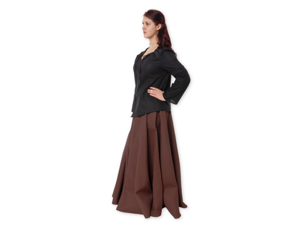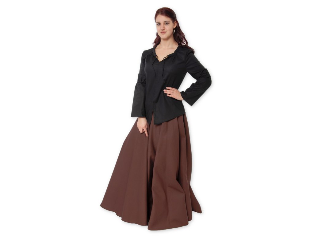 Vzdušná středověká blůza bude ideální volbou pro jednoduchý a přitom elegantní dámský kostým. Výstřih se dá upravit šňůrkou na zavázání. Dlouhé rozšířené rukávy stažené nad lokty podtrhnou ženský půvab. Spodní přední rozparek rafinovaně poodhalí váš pas. Jedinečná příležitost, jak se pochlubit ozdobným opaskem. Více o použitém materiálu se dočtete zde: popis materiálů.