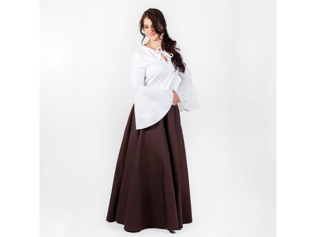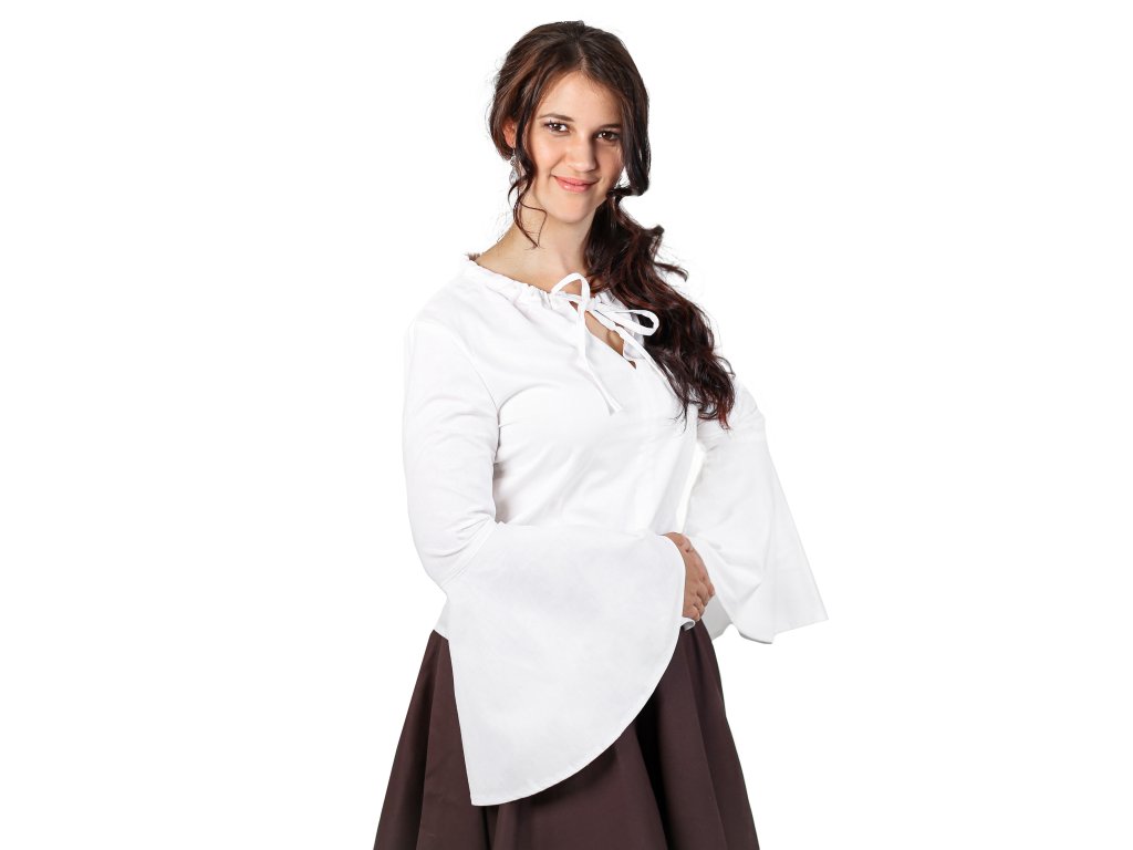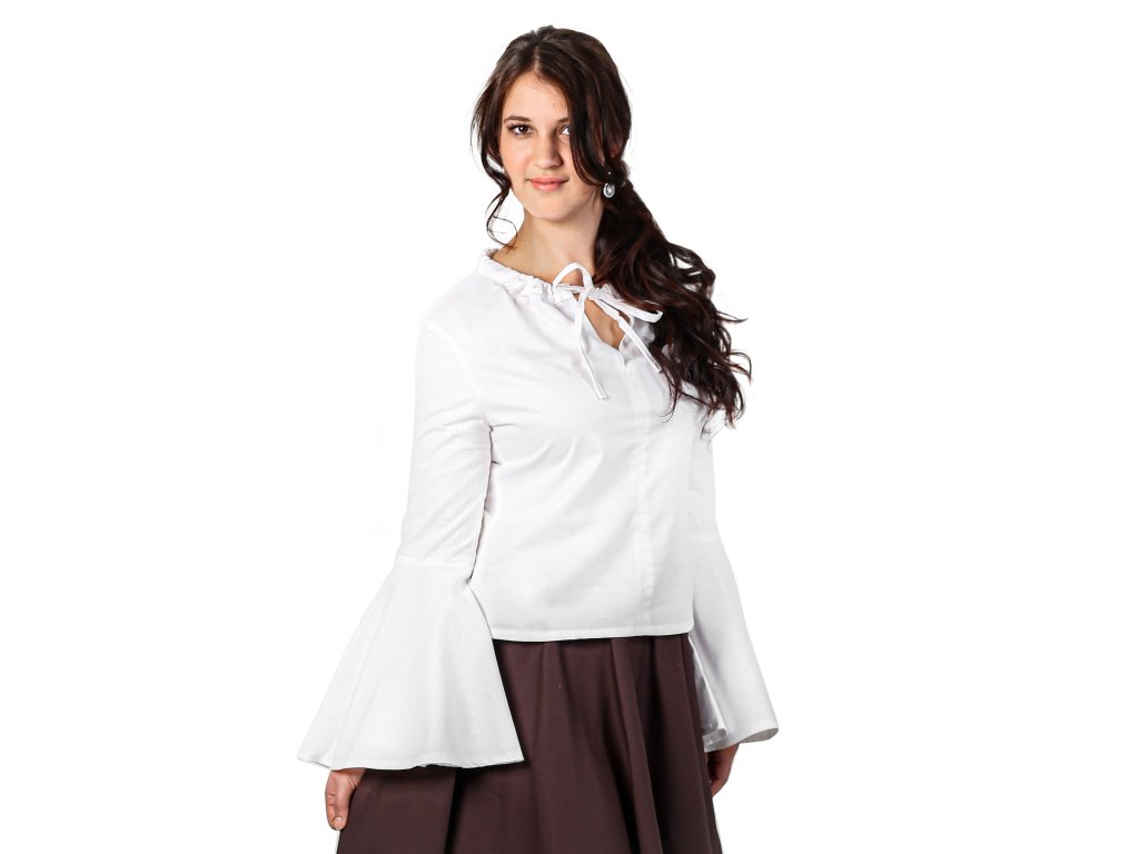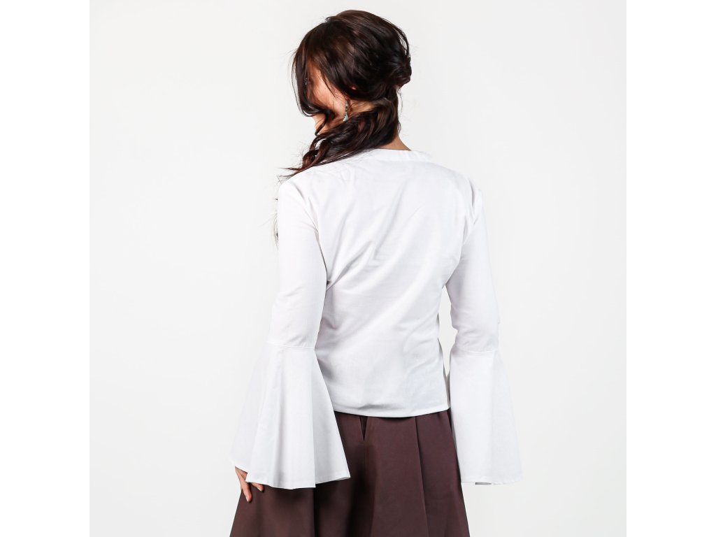 Krásná jednoduchá blůza z bavlněného plátna s rozšířenými rukávy, které vnesou půvab do každého pohybu. K sukním a šněrovačce z naší dílny jako stvořená. Velikost výstřihu lze upravit pomocí šňůrky na zavázání. Více o použitém materiálu se dočtete zde: popis materiálů.