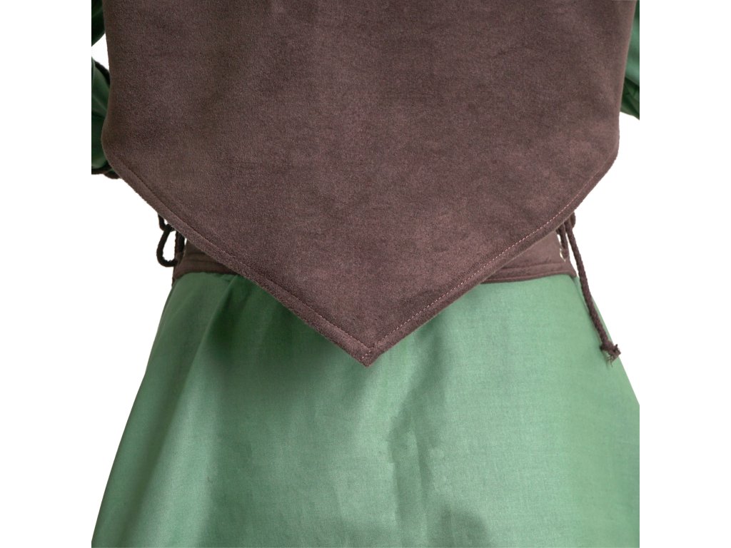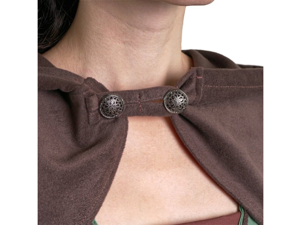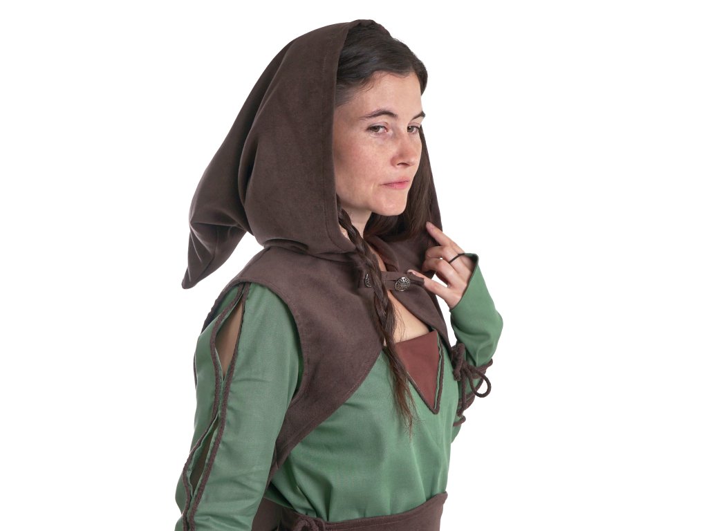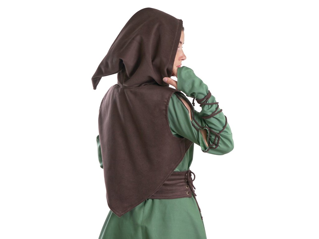 Kápě je skvělým doplňkem k historickému či fantasy kostýmu. V kombinaci s jednoduchým dámským bolerkem vytváří jedinečný doplněk nejen pro každou elfí princeznu, něžnou panovnici či udatnou bojovnici. Je vhodné také ke každodennímu outfitu pro každou ženu, která má ráda jedinečný styl. Hodí se nejen k šatům, ale také k blůze či halence. Fantazii se meze nekladou. Jednoduché dámské bolerko se špičatou kápí se zapínáním na ozdobný kovový knoflík je ušito z pohodlné scuby (broušený semiš). Užší střih v oblasti prsou dokonale zvýrazní vaše přednosti. Zadní strana bolerka je prodloužena až k pasu. Vybrat si můžete z více barevných variant: hnědé, vínové, černé, zelené.