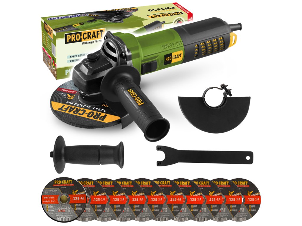 Lehká bezuhlíková úhlová bruska Procraft PW1550 s příkonem 850 W a regulací otáček 200–11 000 ot/min. Ideální pro práci v omezených prostorech. Součástí balení je sada 10 řezných kotoučů CD125x1.0b pro přesné a rychlé řezy.