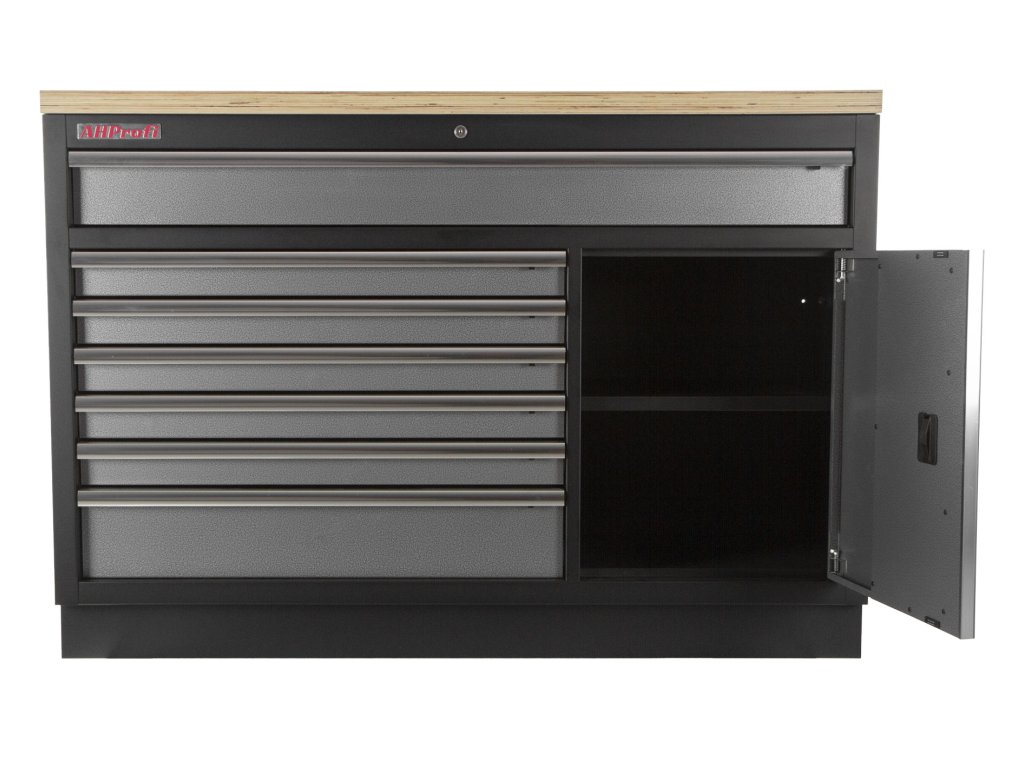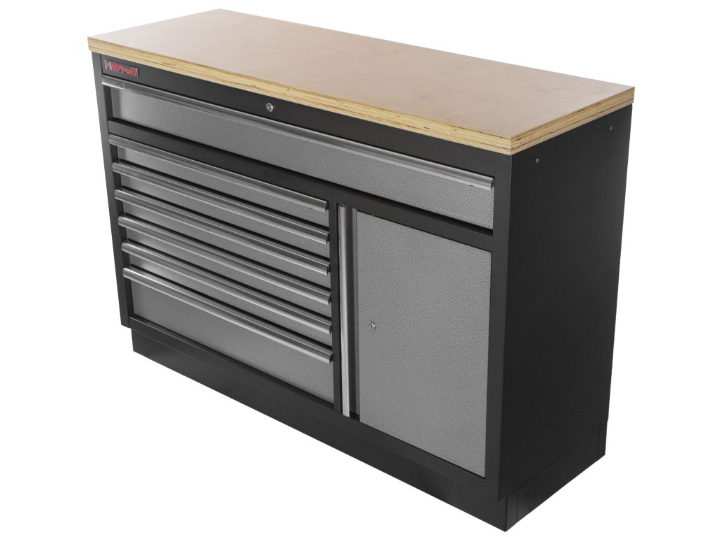 Široká celokovová dílenská skříňka se 7 zásuvkami, skříňkou a dřevěnou pracovní deskou.