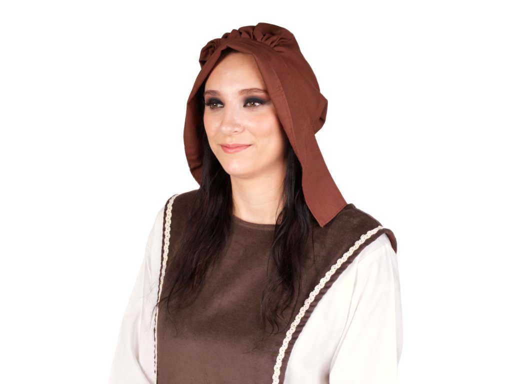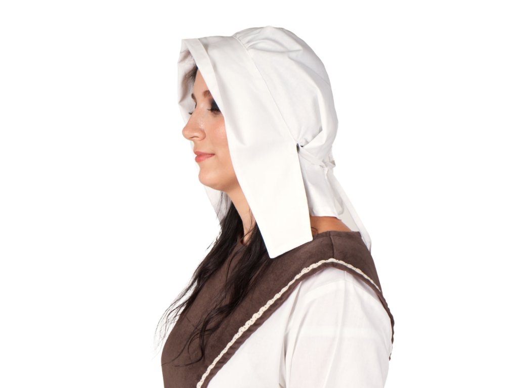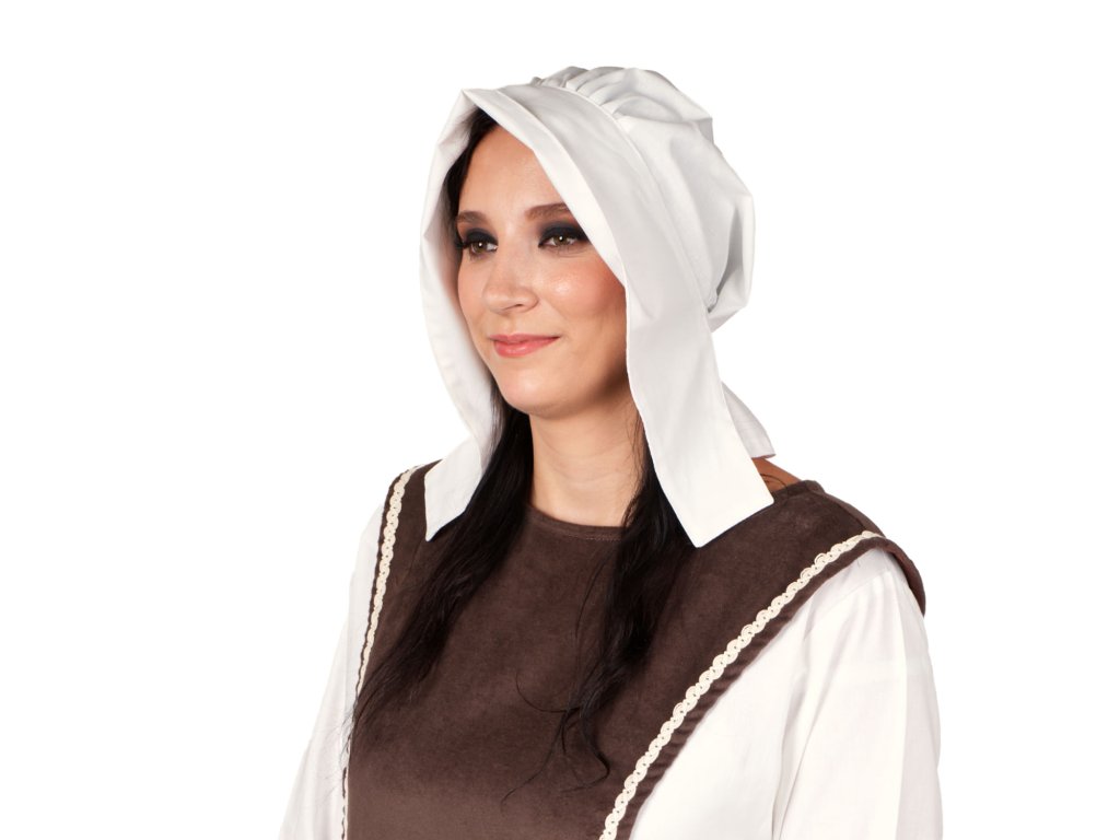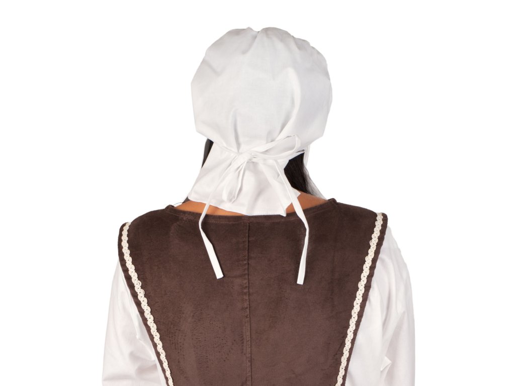 Plátěný čepec se zesíleným okrajem vhodný k dámskému kostýmu z nižší společnosti. Nezbytná pokrývka hlavy pro děvečky a nádenice. Díky stužkám k zavázání perfektně drží na hlavě i při pohybu. Velikost je univerzální, k mání v několika barvách. Více o použitém materiálu se dočtete zde: popis materiálů.