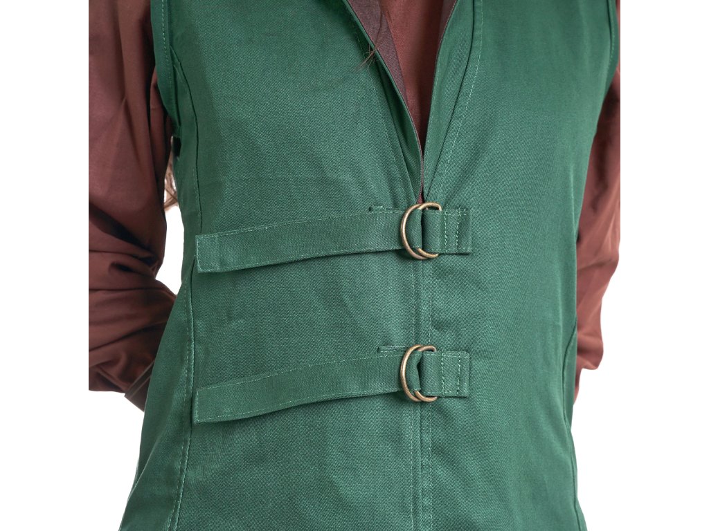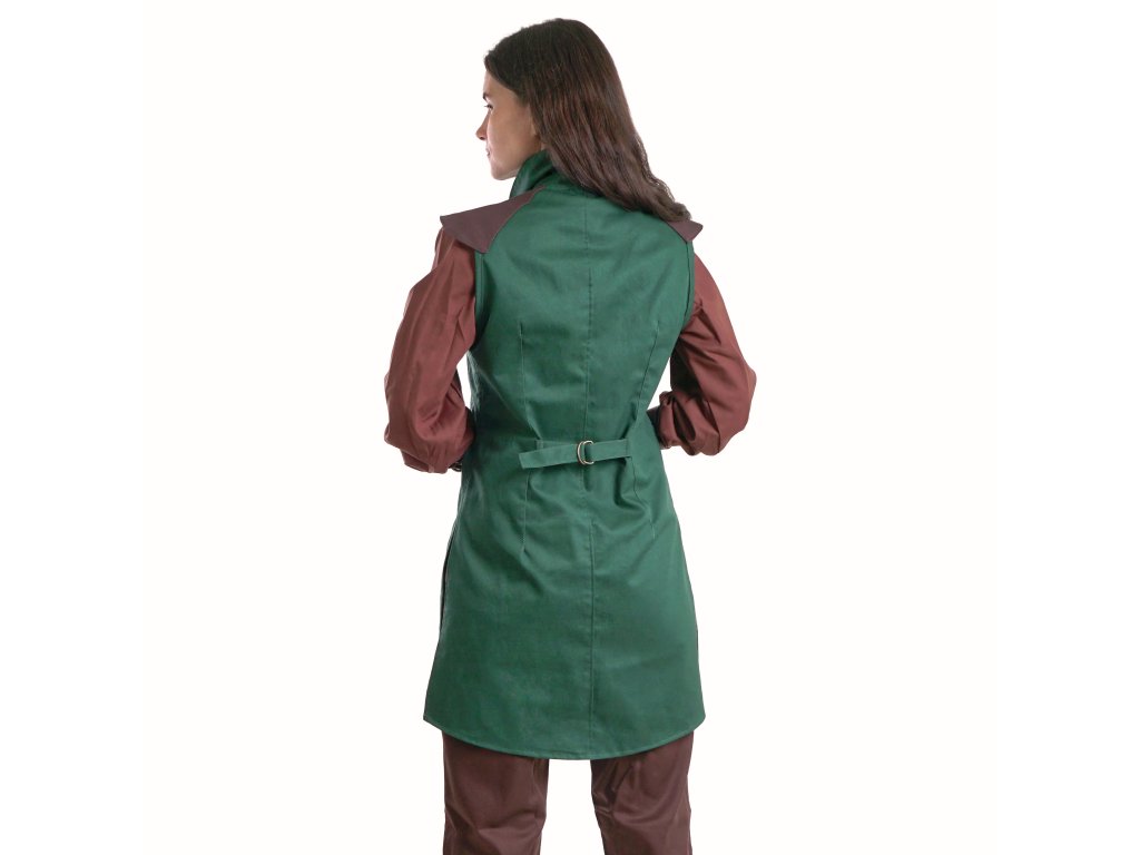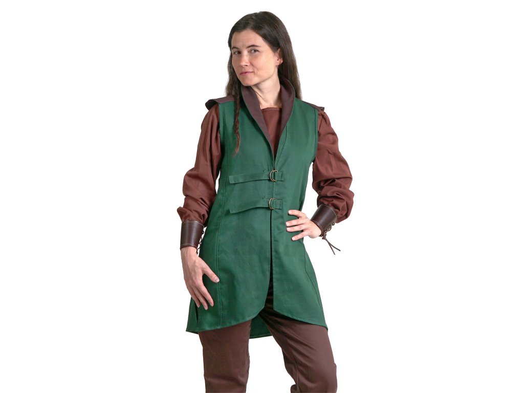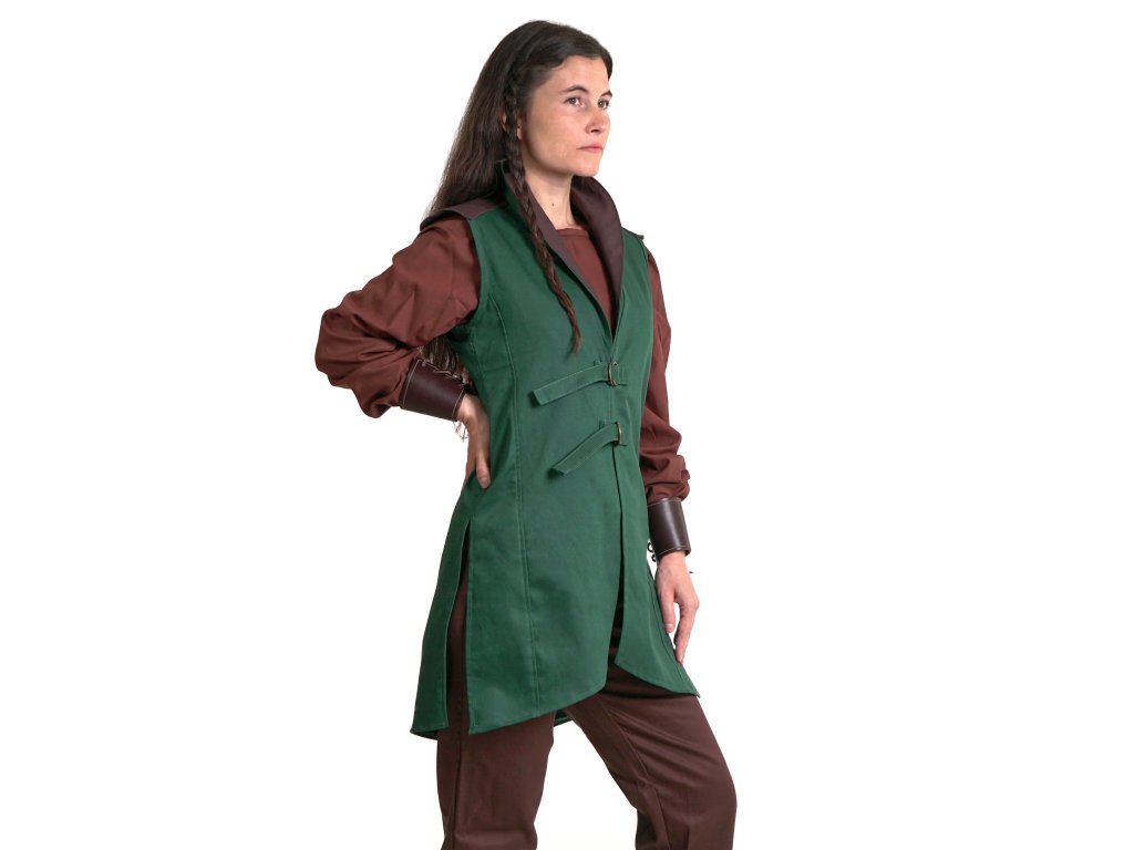 Jednoduchá elegantní dámská vesta Calen je jako stvořena pro všechny elfí bojovnice, které dávají přednost kalhotám před sukněmi či šaty. Vesta dokonale padne k blůze či k halence. Dámská vesta se hodí na všechny dobrodružné výpravy do všech koutů Středozemě. Je ušita ze 100% bavlny, zapíná se utažením dvou pásků pomocí polokroužků na přední straně. Vesta se lehce přizpůsobí každé ženské postavě pomocí stáhnutí pásku na zadní straně a bočních rozparků, které dávají větší svobodu v pohybu. Nepřehlédnutelný je také límec na dámské vestě. Můžete si jej postavit na stojáčka, čímž přidáte na vážnosti celého kostýmu, nebo jej můžete ohnout a vesta bude rázem působit elegantně. Rozdílná barva látky na ramenou a límečku vytváří jemné detaily, které vestě dodávají elegantnější vzhled. Doladit svůj kostým můžete ještě opaskem či dalšími doplňky vhodnými na LARP či cosplay. Dámská vesta Calen je k mání ve 4 velikostech a ve dvou barvách: zelená, černá.