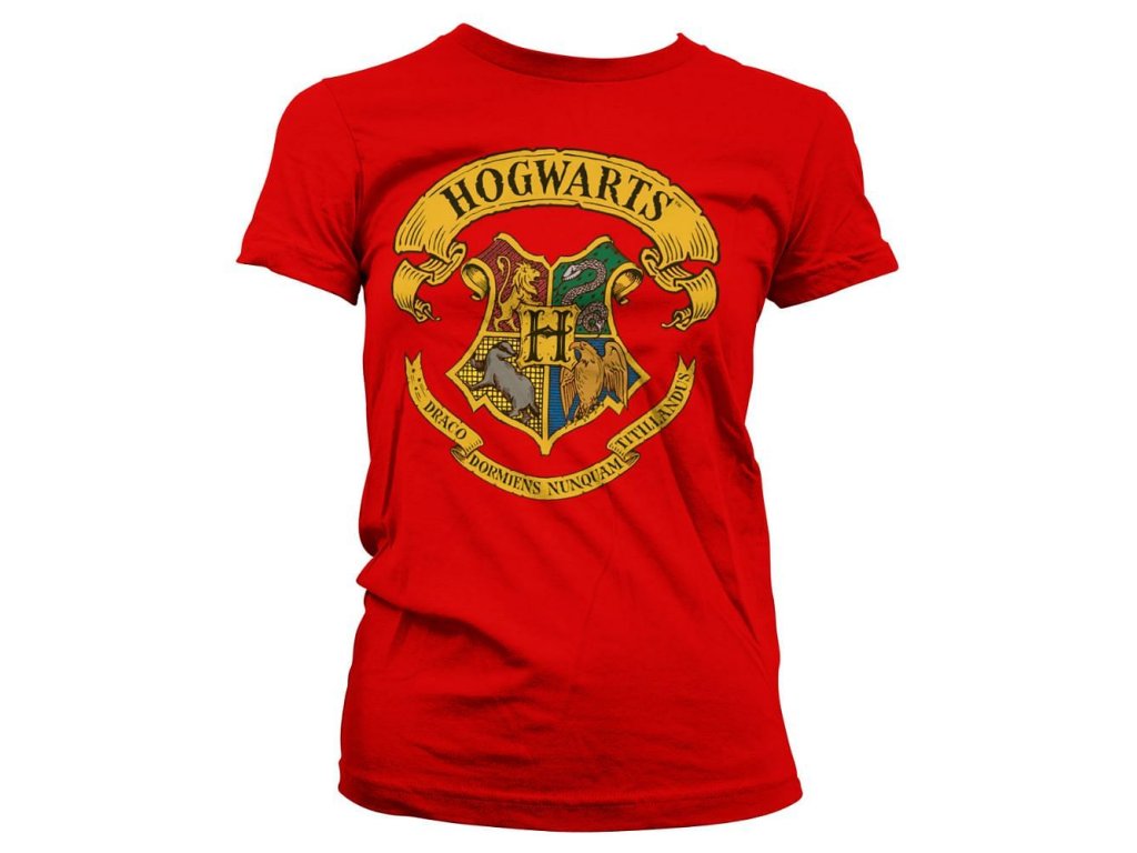 Dámské červené bavlněné tričko s motivem erbu Školy čar a kouzel v Bradavicích, podle příběhů o Harry Potterovi.