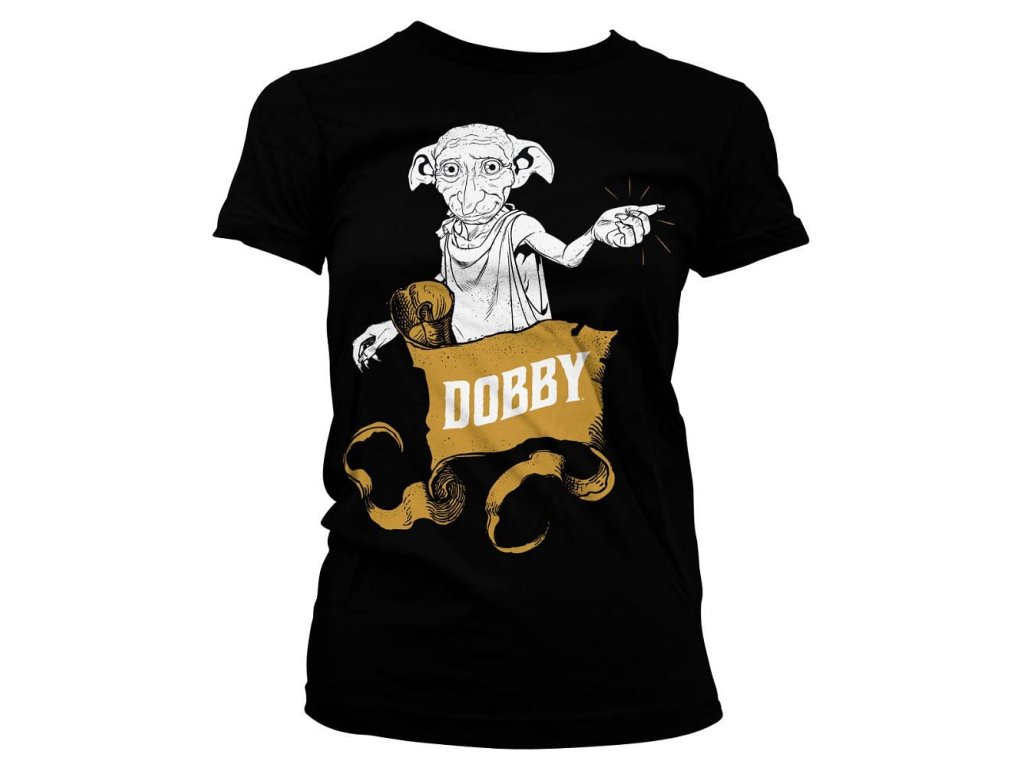 Dámské černé tričko s domácím skřítkem Dobbym pro všechny milovnice příběhů Harry Pottera od J. K. Rowlingové. Oficiálně licencovaný produkt.
