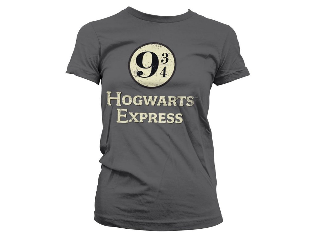 Šedé dámské tričko s motivem z oblíbených knih a filmů o Harry Potterovi - s vyobrazením znaku Nástupiště 9 a 3/4, odkud vyjíždí Bradavický expres. Oficiálně licencovaný produkt.