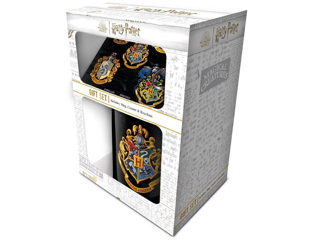 Hledáš skvělý dárek pro fanoušky Harryho Pottera? V dárkové sadě ze školy čar a kouzel najdeš krásný hrnek, korkový podtácek a klíčenku - to vše s barevným erbem Bradavic. Originální sada pro milovníky kouzelného světa J. K. Rowlingové.
