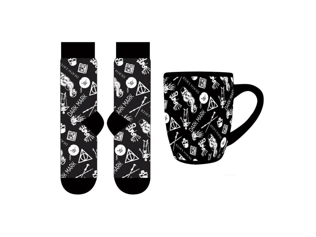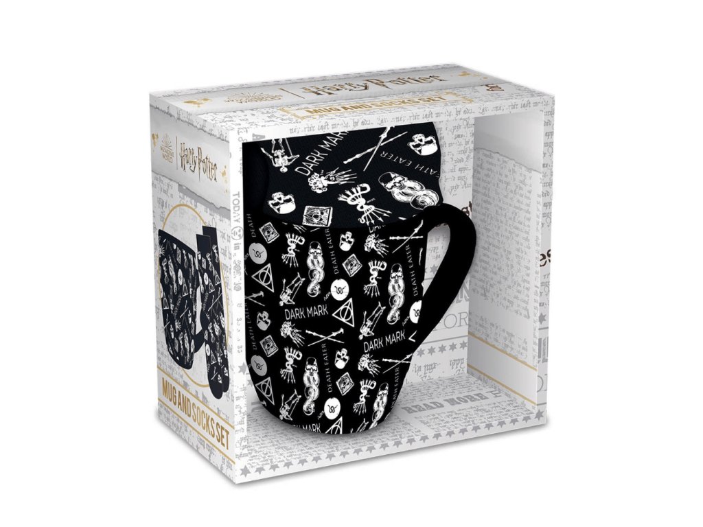 Krásná dárková sada pro smrtijedy a přisluhovače Temného pána. V jednom balení nalezneš elegantní černé ponožky s bílými symboly relkvií smrti, temnými znamením a dalšími sybmoly spojenými s černou magií. Společně s ponožkami je součástí balení také stylově sladěný hrnek o objemu 300 ml. Hrnek je vhodný do mikrovlnky a lze ho mýt v myčce. Ponožky mají univerzální velikost UK 3-8 (EU 36-41).