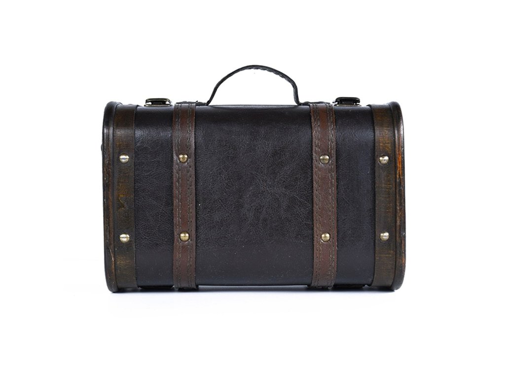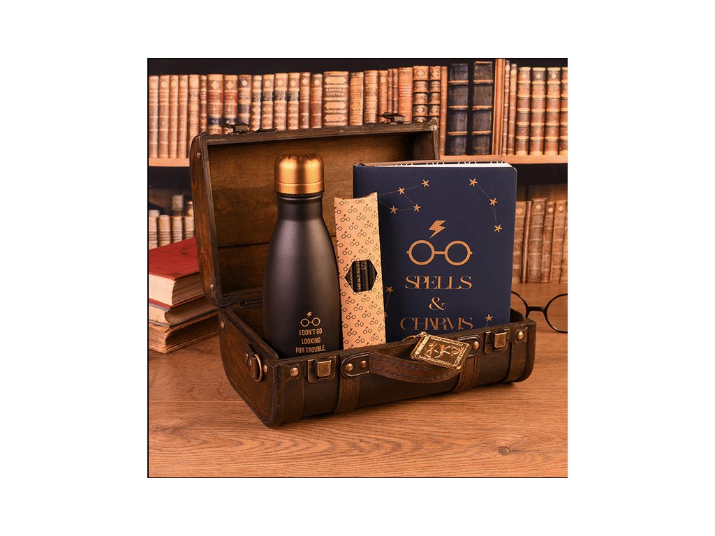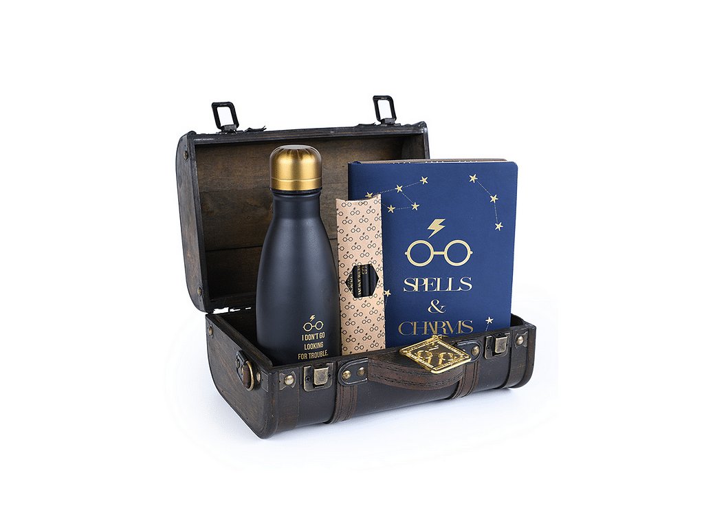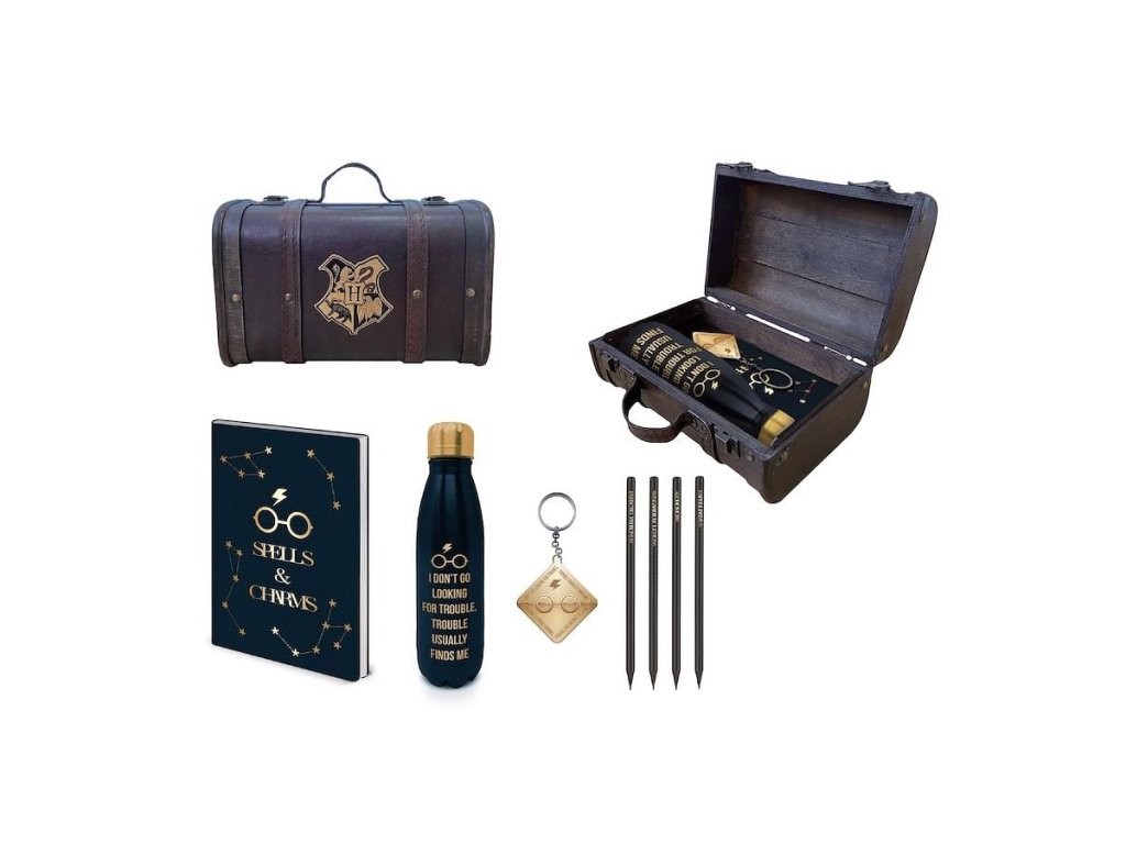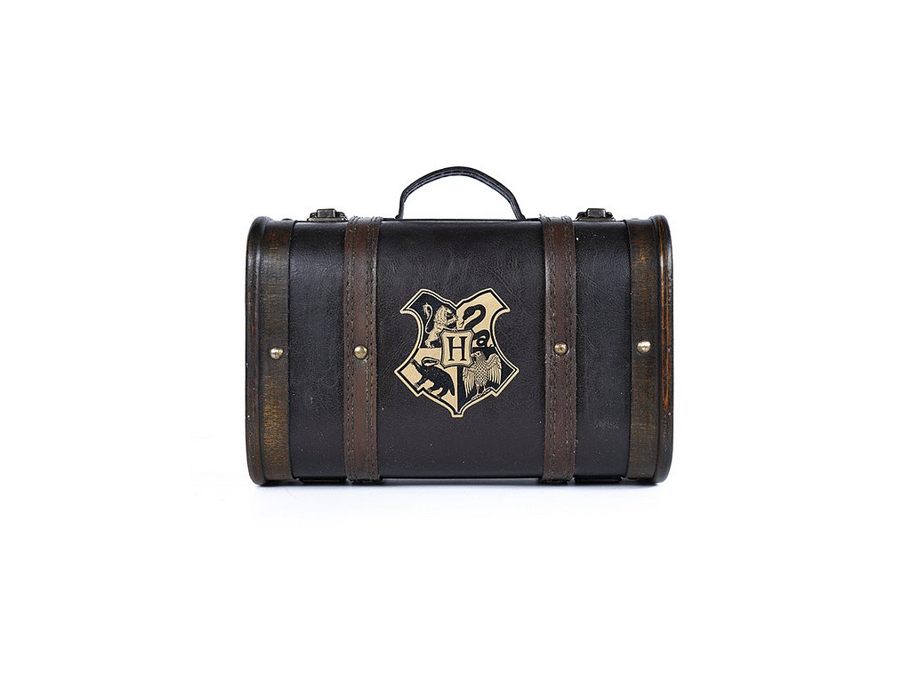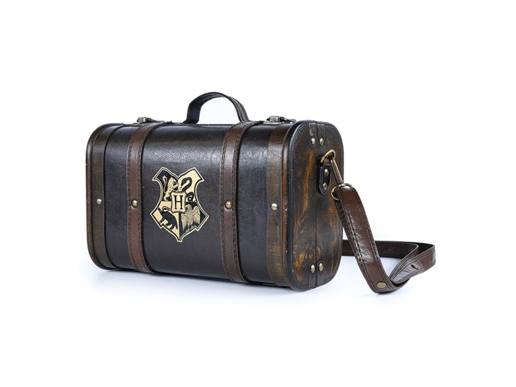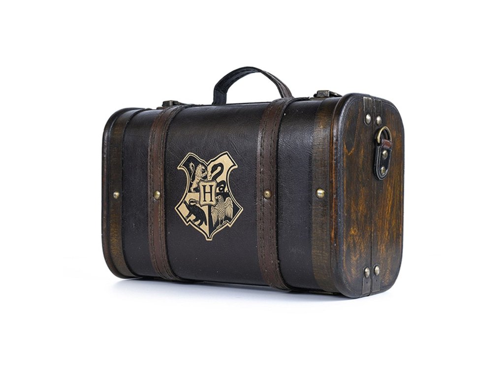Kouzelný kufřík Harry Potter vás osloví svým precizním provedením! Kufřík je vyrobený z kvalitního dřeva a potažený umělou kůží a kovovými doplňky s možností odepinacího popruhu přes rameno a namalovaným erbem Bradavic na přední straně. Kufřík obsahuje termo láhev o objemu cca 500 ml, linkovaný zápisník velikosti A5, kovovou klíčenku a čtyři tužky.