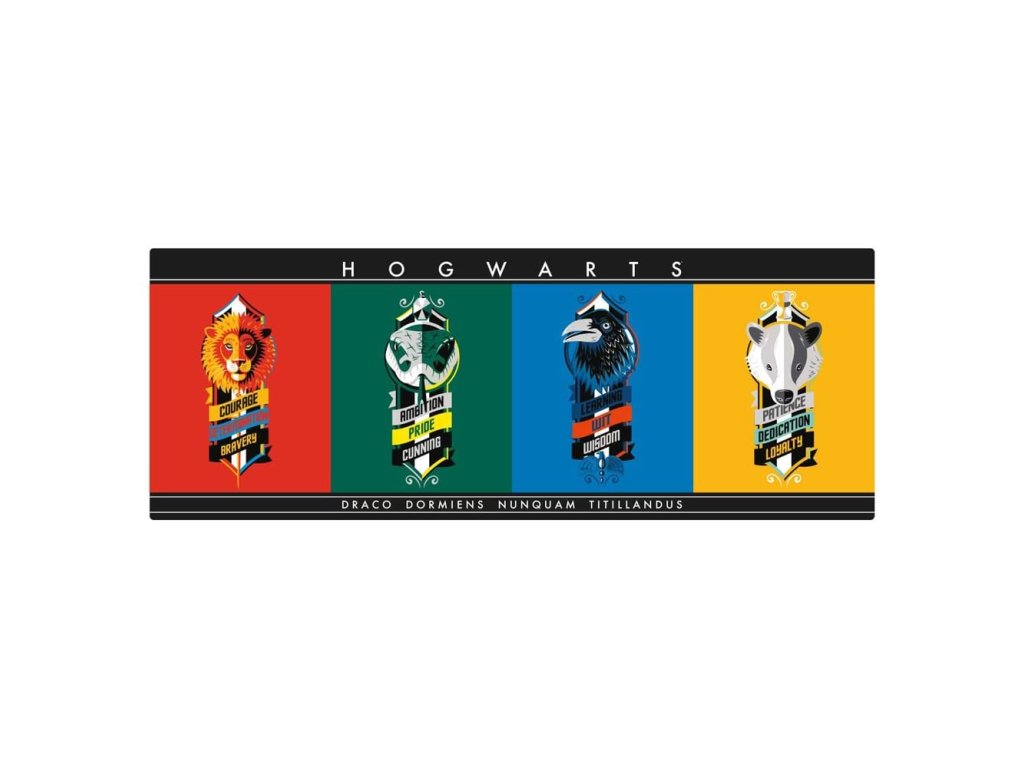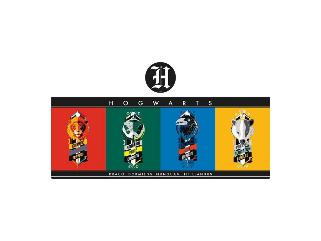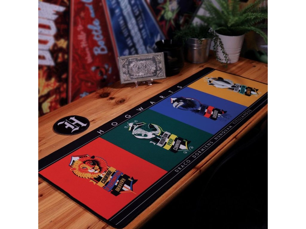 Dárková sada ze světa Harryho Pottera pro tvůj pracovní i herní stůl! Barevná a praktická herní podložka s krásně vyvedenými znaky kolejí Nebelvíru, Zmijozelu, Havraspáru a Mrzimoru má povrch z kvalitní tkaniny, zpevněné rohy a protiskluzovou spodní část. Součástí balení je pak také černý podtácek o rozměru 10 x 10 cm, rovněž opatřený spodní částí proti skluzu.