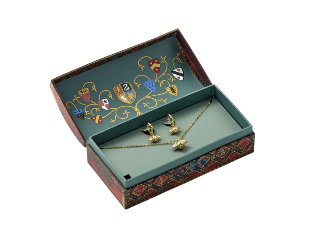 Dárková sada Zlatonka je jako dělaná pro všechny, kteří fandí famfrpálu – nebo prostě jen milují kouzelnický svět. Uvnitř elegantního boxu v designu famfrpálové truhly najdeš náhrdelník a náušnice se Zlatonkou, nejcennějším míčem famfrpálového zápasu. Díky propracovanému balení působí celá sada jako poklad z bradavického trezoru. Ať už ji daruješ, nebo si ji necháš pro sebe, rozhodně zazáří.