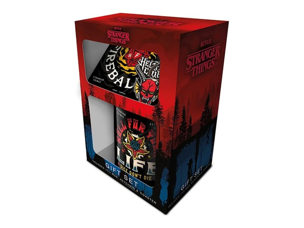 V dárkové sadě pro fanoušky oblíbeného seriálu Stranger Things najdete pěkný keramický hrnek, gumovou klíčenku a korkový podtácek - to vše s motivy Hellfire Clubu. Vše je baleno v hezké dárkové krabičce.