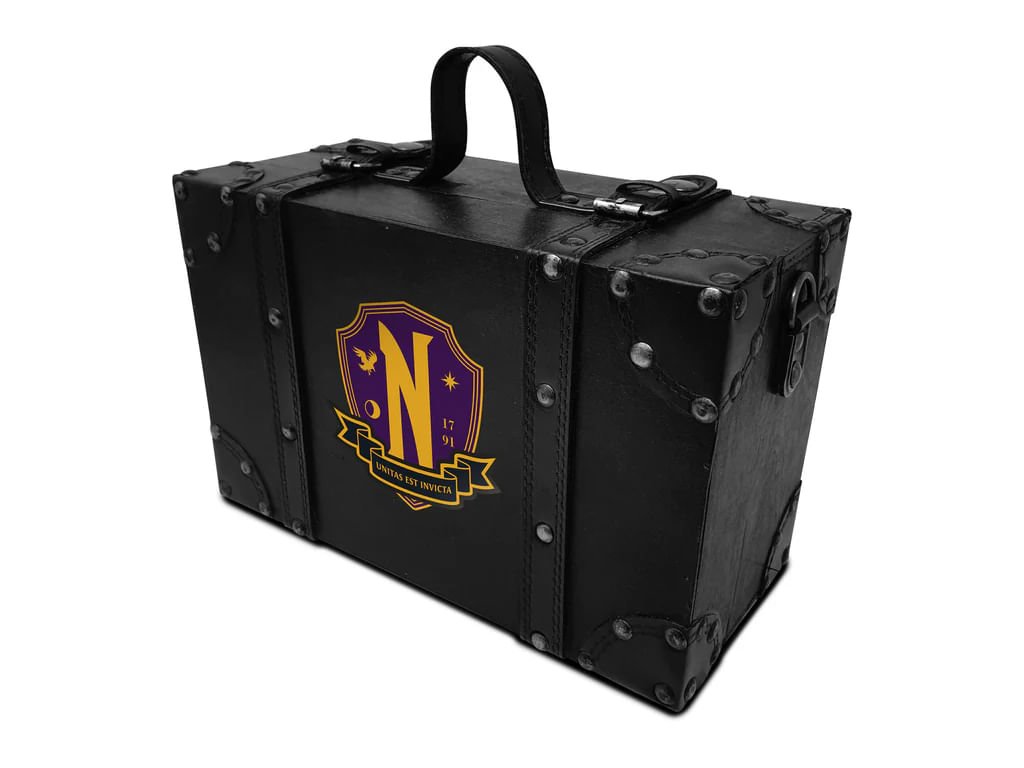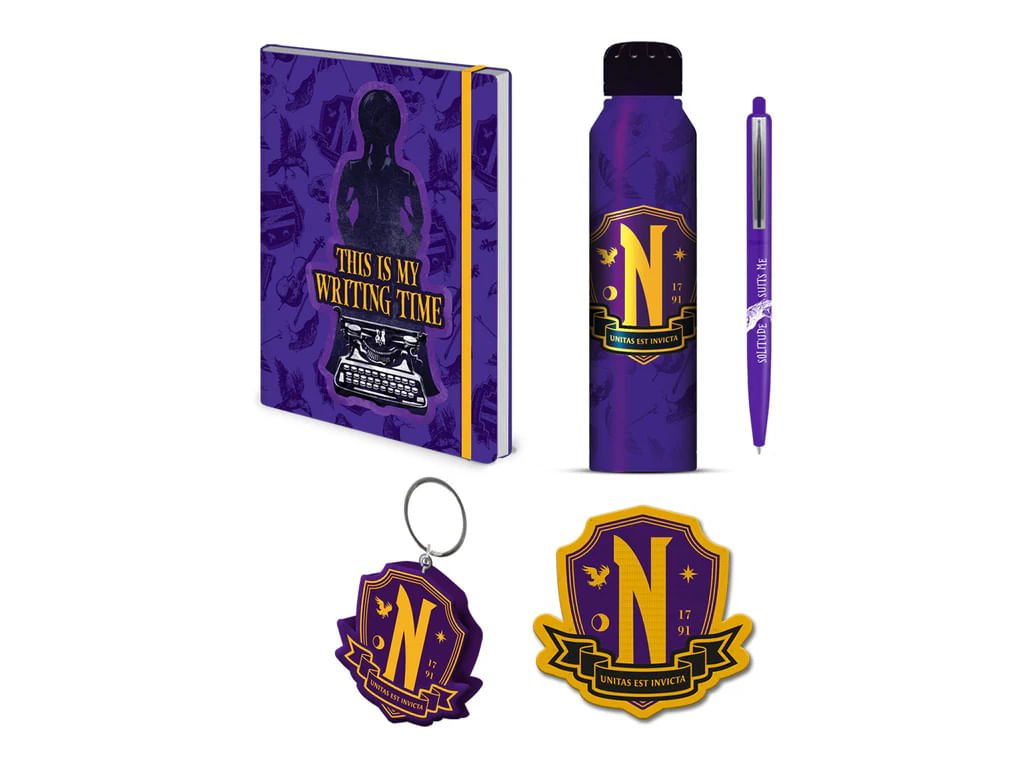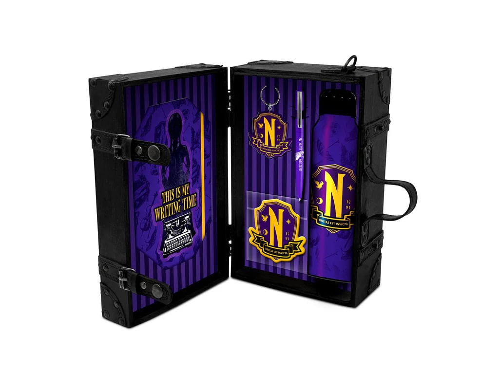 Vstup do světa Nevermore Akademie s oficiální dárkovou sadou inspirovanou Wednesday Addams. Vše je laděno do stylu Havranů – tajemné, černé a elegantní. Uvnitř najdeš 350ml kovovou lahev, kulaté pero, sešit A5, kovovou klíčenku, odznak a praktický úložný kufr s popruhem, ve kterém je vše stylově zabaleno. Všechny produkty jsou součástí exkluzivního setu – samostatně je neseženeš. Ideální jako dárek, nebo když si chceš udělat radost kompletní sadou stylového merchandisu ze seriálu Wednesday. Nechť tvůj školní den (nebo pracovní stůl) vypadá stejně stylově jako život jediné opravdové outsiderky.