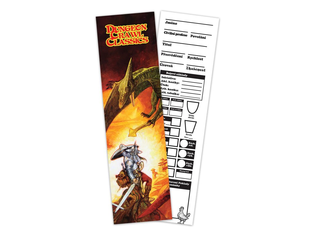 Papírová záložka s motivem ze hry na hrdiny Dungeon Crawl Classics (DCC). Druhá strana se dá použít jako minimalistický deník postavy na 0. úrovni.