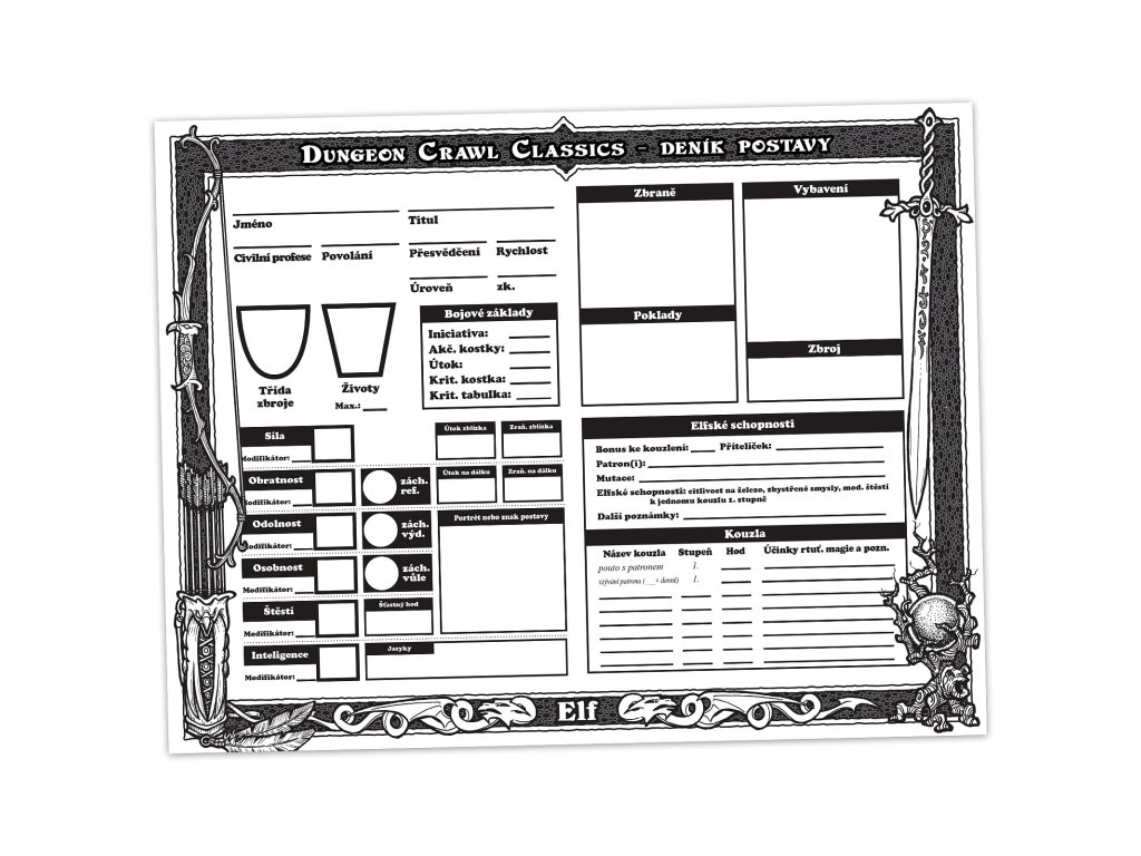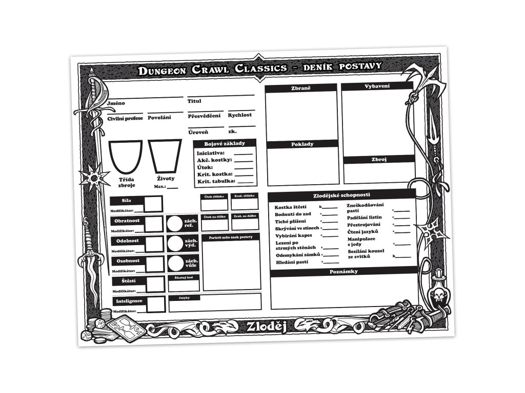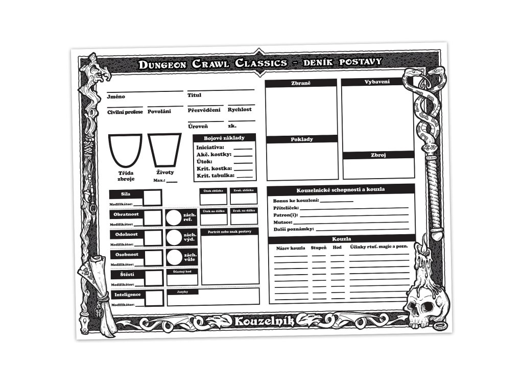 Deník postavy pro hru na hrdiny Dungeon Crawl Classics (DCC). Deník je vytištěný na obě strany, tudíž se jeden deník pro 2 postavy využít dá. Typ papíru: 190g ofsetový papír.