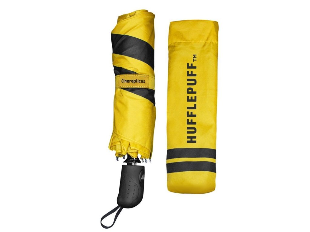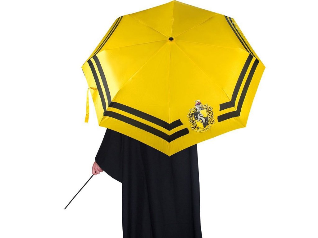 Skvělý stylový žlutý čarodějnický deštník se znakem koleje Mrzimor na škole čar a kouzel v Bradavicích, podle příběhů o Harry Potterovi.