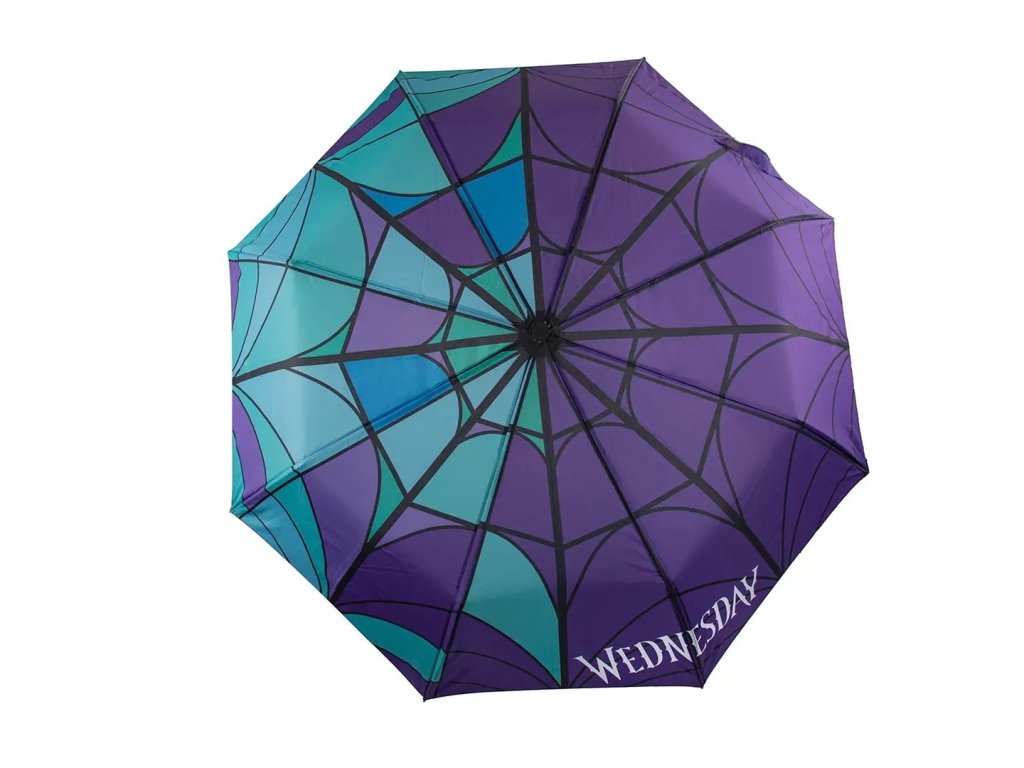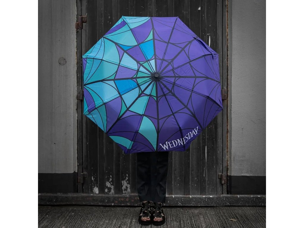 Originální deštník s grafikou populárního seriálu Wednesday se hodí pro nepřízeň počasí i jako společník ke stylovému oblečení. Průměr rozevřeného deštníku je 121 cm.