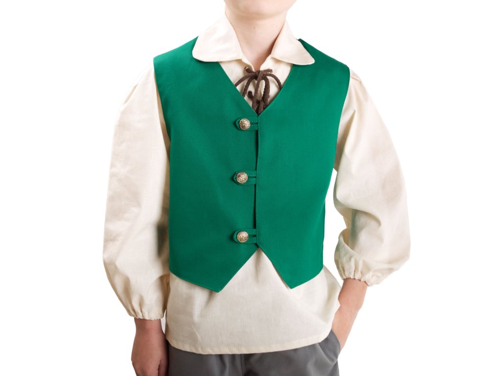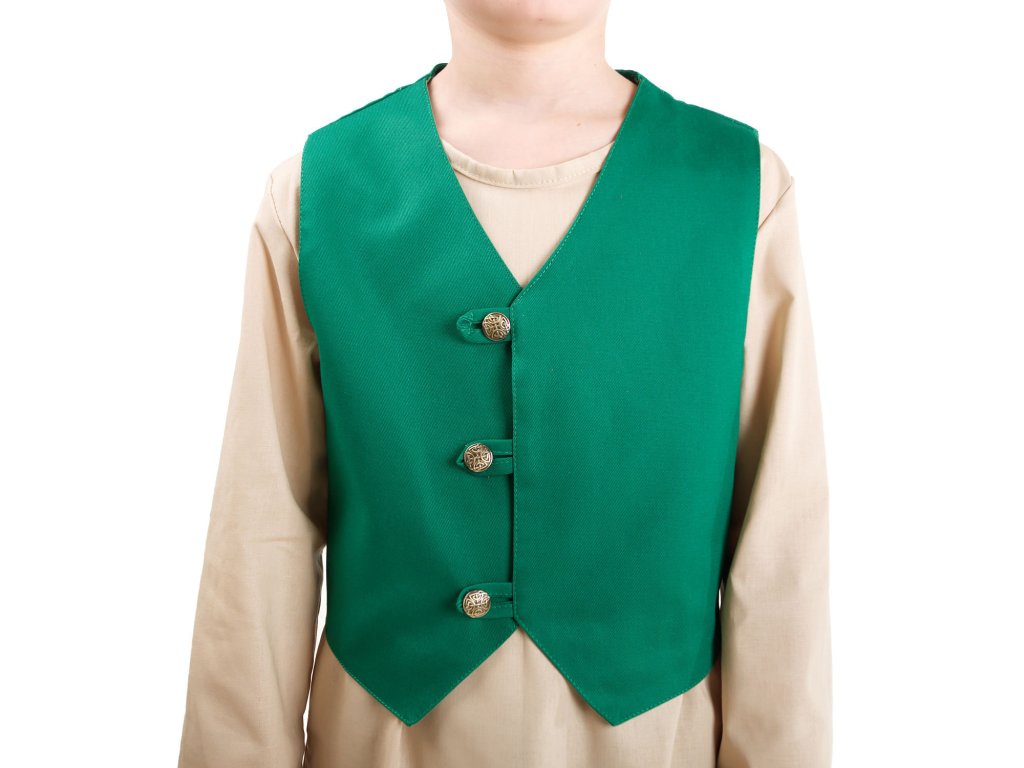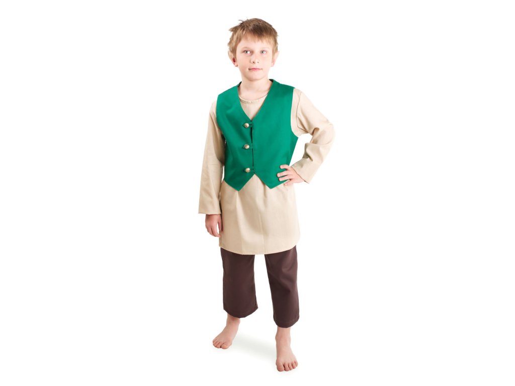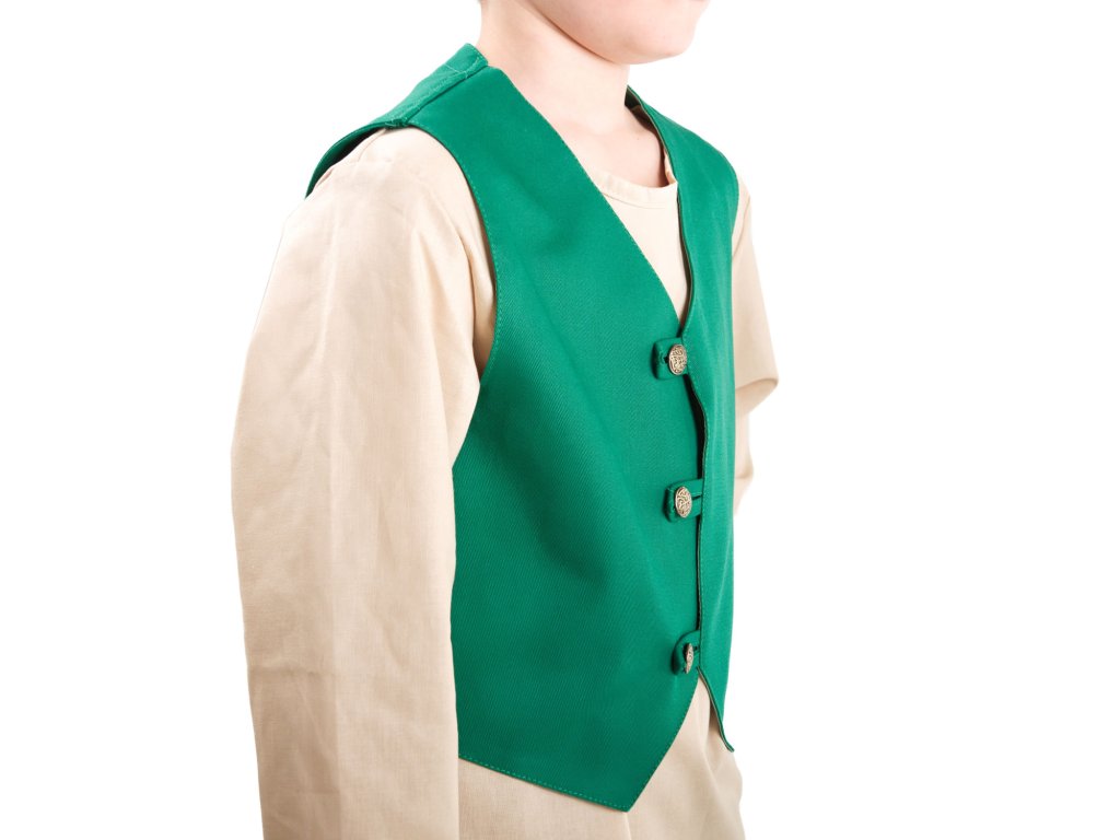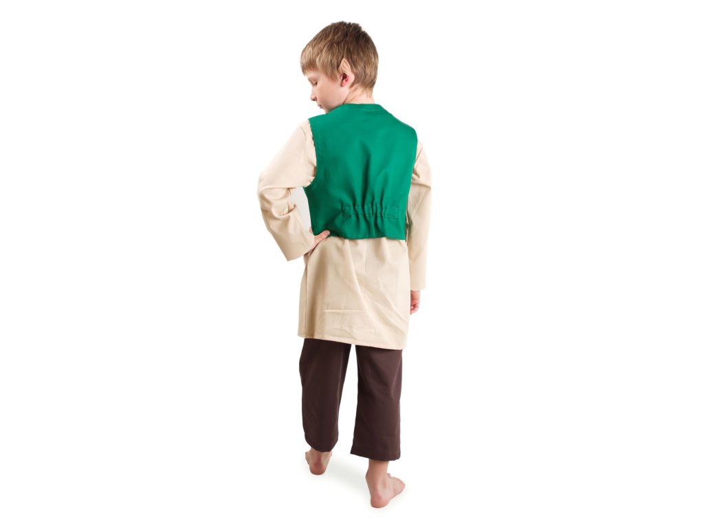 Krásná dětská vesta je jako stvořená pro fantasy či historický kostým. Váš prcek ji však může hrdě nosit i při běžné procházce do parku, do školky či školy nebo do města na nákup. Vesta je vyrobena ze 100% bavlny (kepr), přední díly jsou podšité bavlněným plátnem. Vpředu se zapíná na 3 knoflíky a vzadu je vypasovaná gumou, takže vesta skvěle padne jak malým i větším hobitkům. Vestičku vyrábíme i v dalších barvách: šedá, hnědá a vínová. Dětská vesta Hobit byla ušita v naší krejčovské dílně. Podívejte se na další dětské kostýmy z naší nabídky a načerpejte inspiraci pro další karneval či halloween.