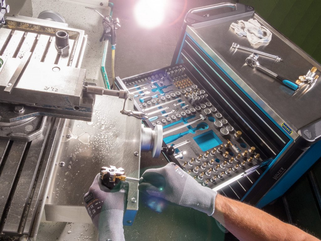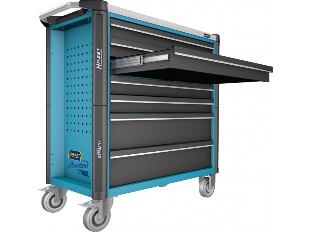 Dílenský vozík s robustní konstrukcí z ocelového plechu se sedmi zásuvkami, které jsou osazeny vodícími lištami s kuličkovými ložisky.