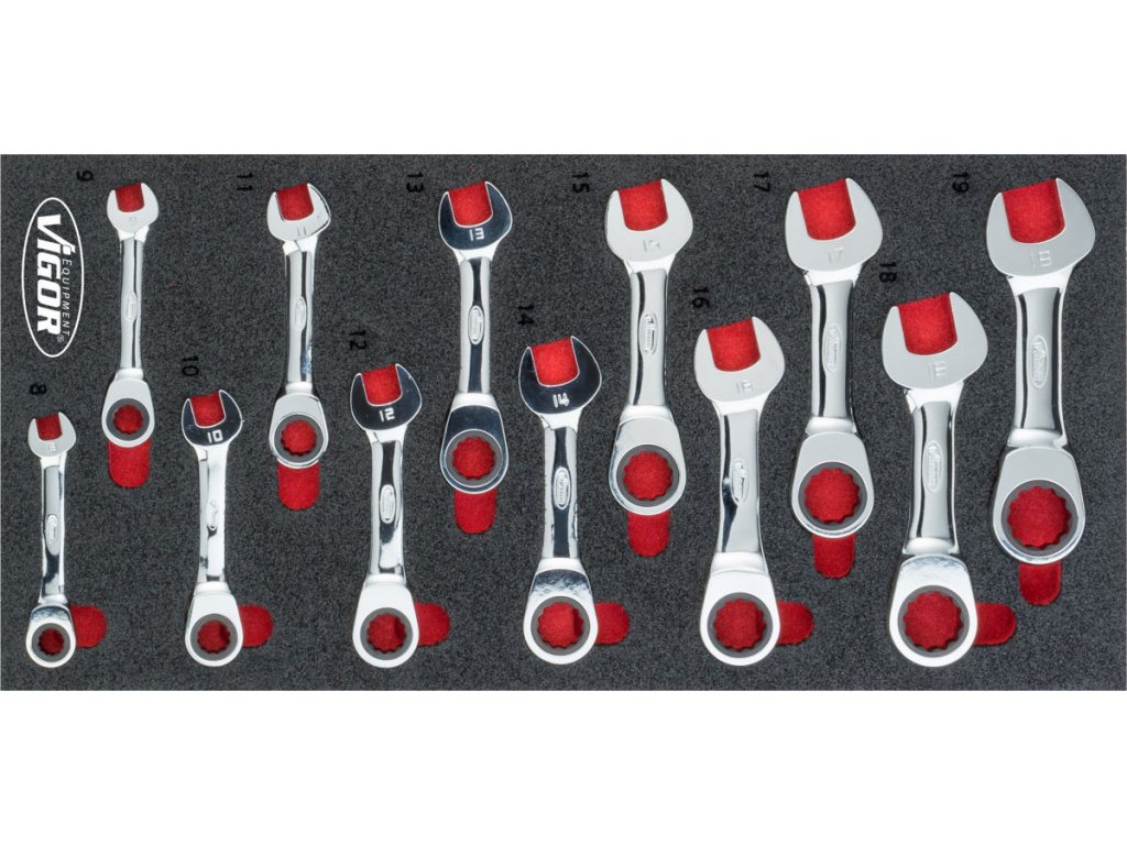 | 12 ks | Krátké ráčnové očkoploché klíčé: 8, 9, 10, 11, 12, 13, 14, 15, 16, 17, 18, 19 mm |