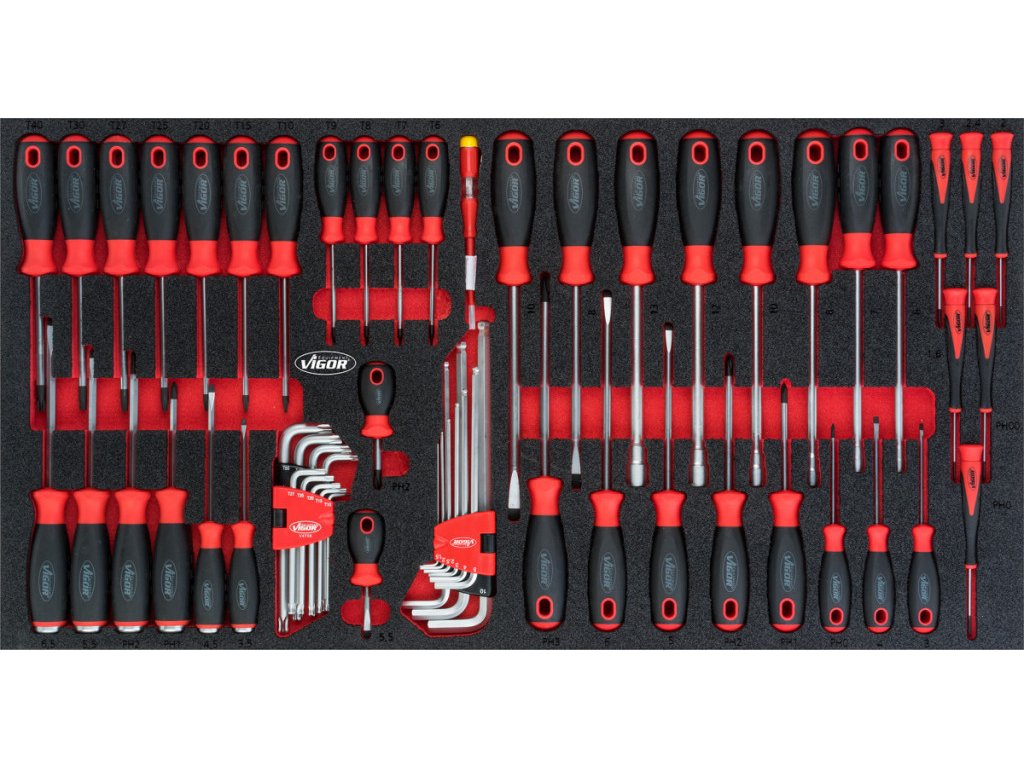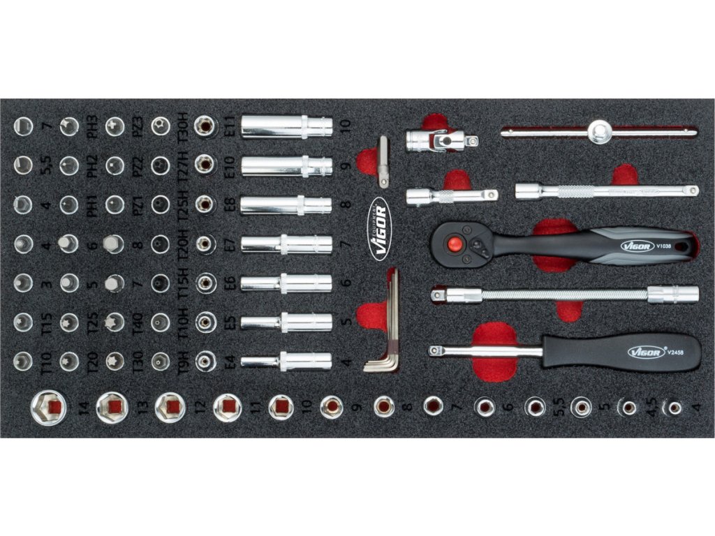 V zásuvkách jsou pěnové výplně dílenských vozíků s běžně používaným nářadím v profesionální kvalitě. V sadách nářadí naleznete golu 1/4", 1/2", 3/8", nástrčné klíče, sadu kleští, kladivo a paličku, velkou sadu šroubováků, IMBUSy, velkou sadu klíčů a mnoho dalšího.