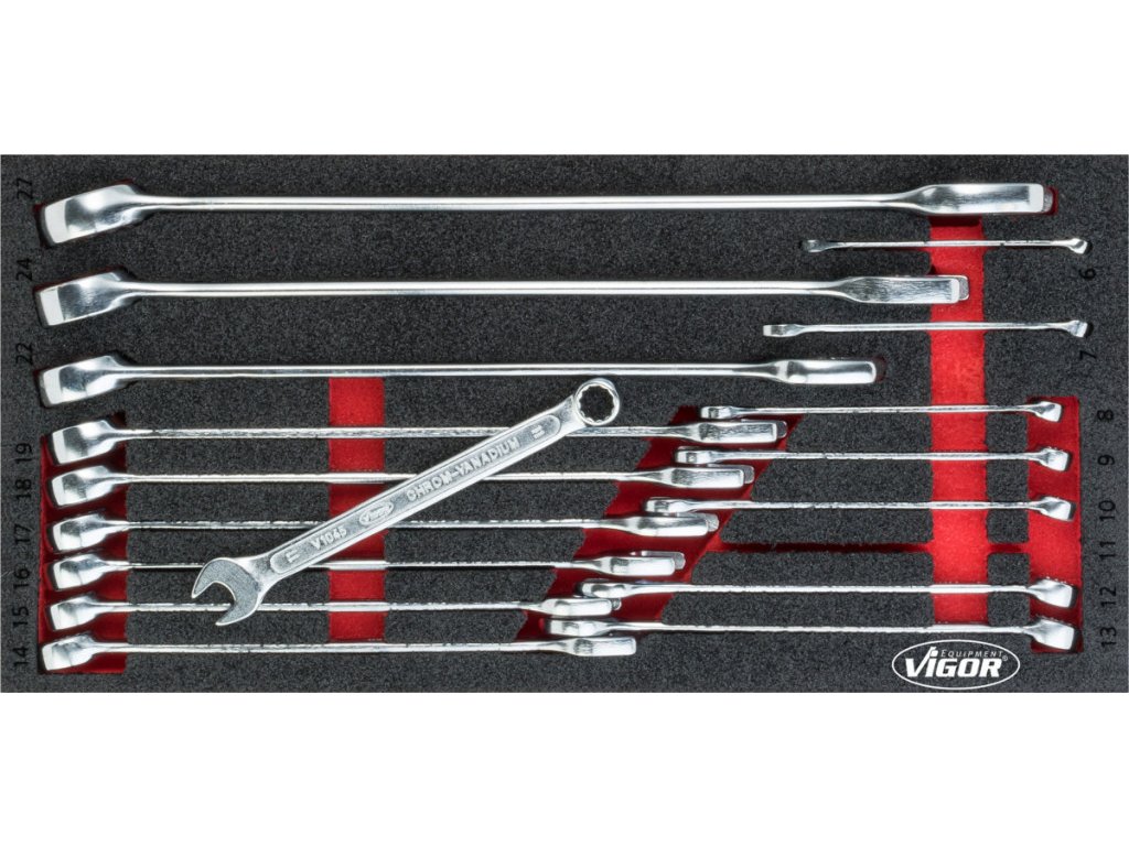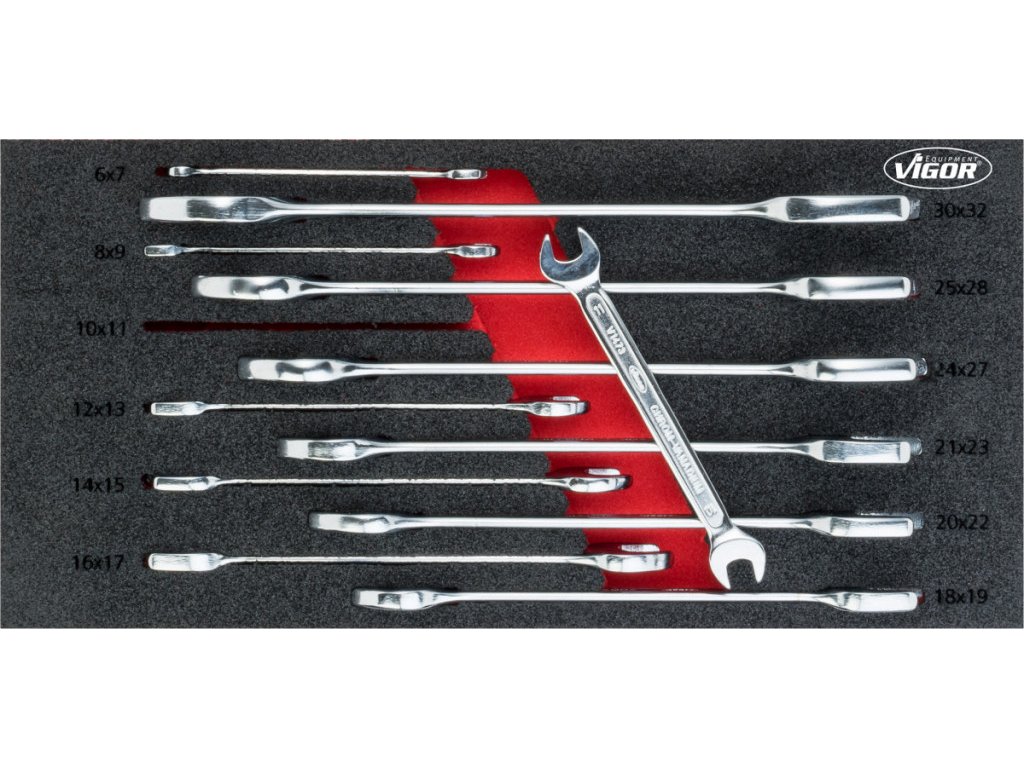| 12 ks | Oboustranné ploché klíče": 6 x 7; 8 x 9; 10 x 11; 12 x 13; 14 x 15; 16 x 17; 18 x 19; 20 x 22; 21 x 23; 24 x 27; 25 x 28; 30 x 32 mm |
