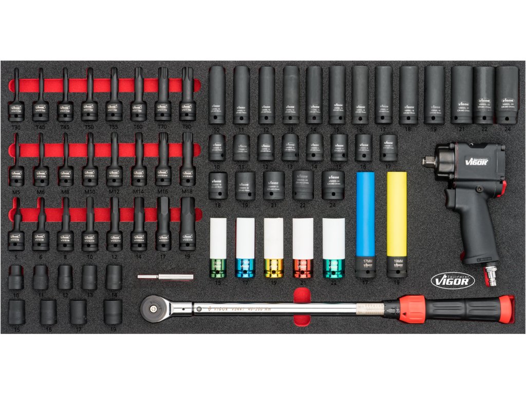 24 ks | Nástrčné klíče 1/2": 10, 11, 12, 13, 14, 15, 16, 17, 18, 19, 20, 21, 22, 24, 27, 30, 32 mm. |