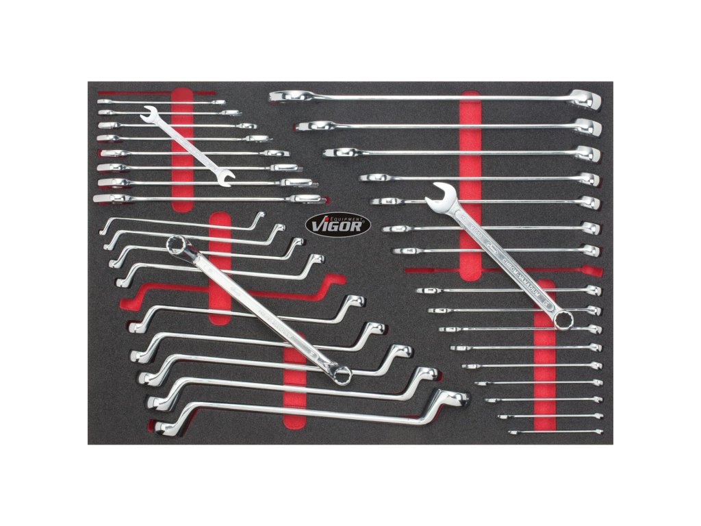 V zásuvkách jsou pěnové výplně dílenských vozíků s běžně používaným nářadím v profesionální kvalitě. V sadách nářadí naleznete golu 1/4", 1/2", 3/8", nástrčné klíče, sadu kleští, kladivo a paličku, sadu šroubováků, velkou sadu klíčů a mnoho dalšího.