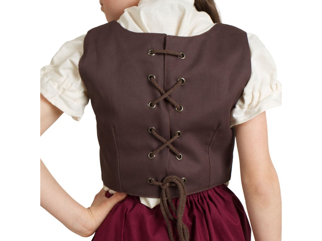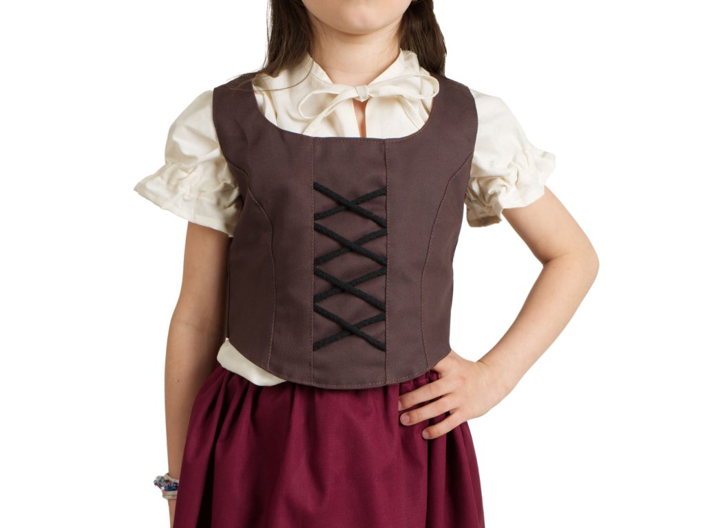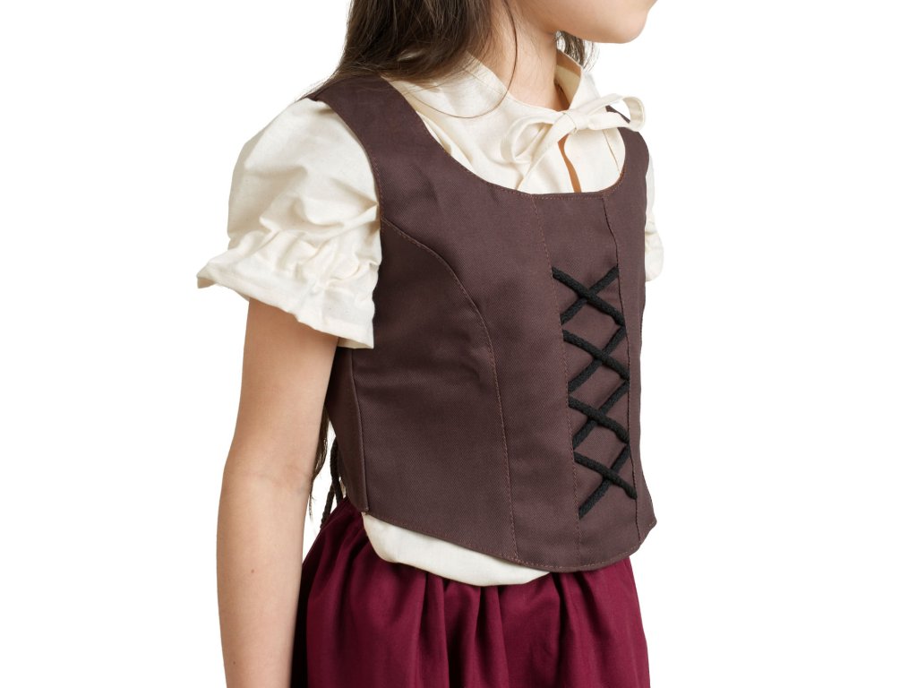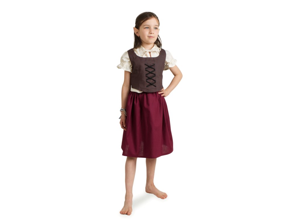 Jednoduchý hnědý dívčí živůtek se zadním šněrováním patří rozhodně k základní výbavě mladé slečny chystající se na nějaké to mecheche jako je maškarní, karneval či halloween. Dívčí živůtek se skvěle hodí jako doplněk k historickému nebo fantasy kostýmu. Zkombinujte s naší hobití sukní, zástěrkou a halenkou a hobití kostým je hotový! Dívčí živůtek Hobitka vznikl v naší dílně pod taktovkou našich švadlenek. Je vyroben z pevné bavlněné látky (kepr) a podšitý plátnem, díky zavazování na zádech skvěle padne na každou dívčí postavu. A co barva? To je občas oříšek… no aby to ladilo k sukni, botám, však to znáte. Dívčí živůtek Hobitka pro vás máme ve třech barvách, stačí si jen vybrat: hnědý, vínový nebo zelený?