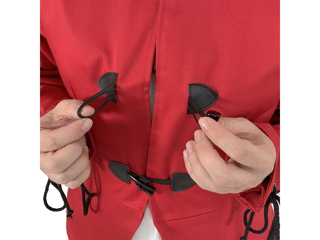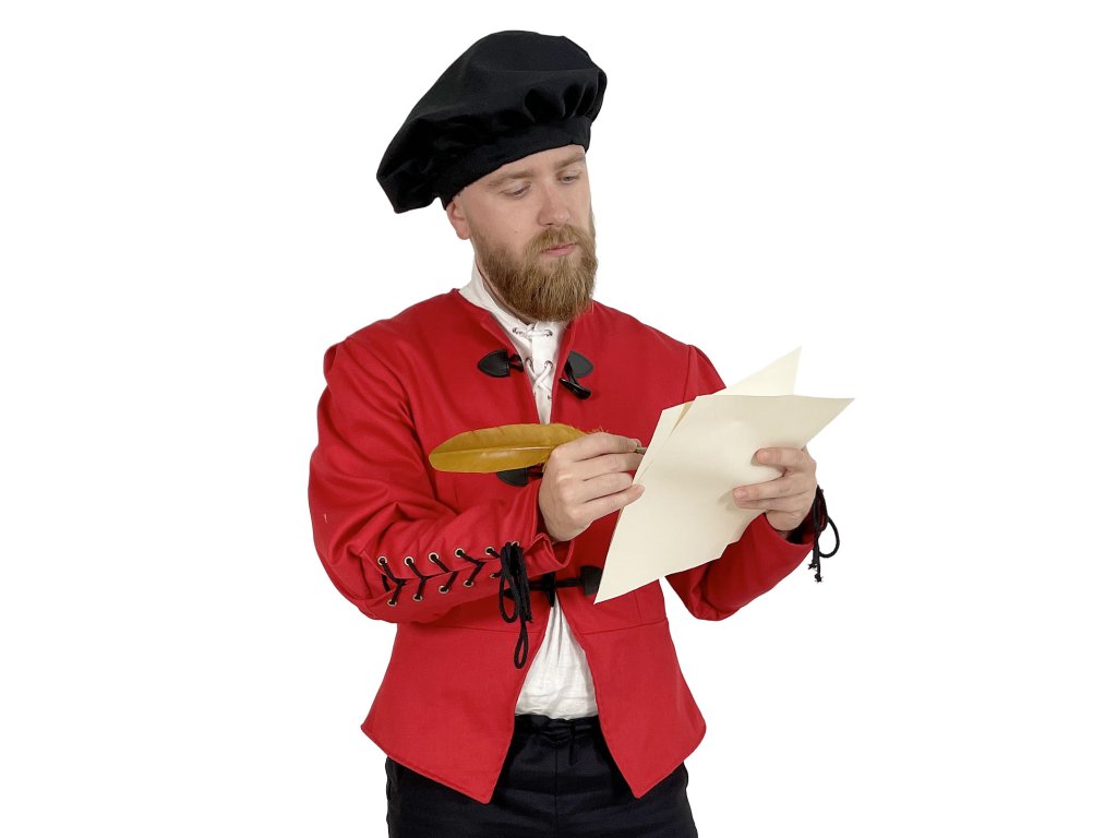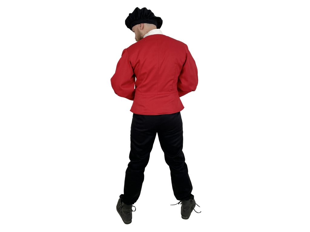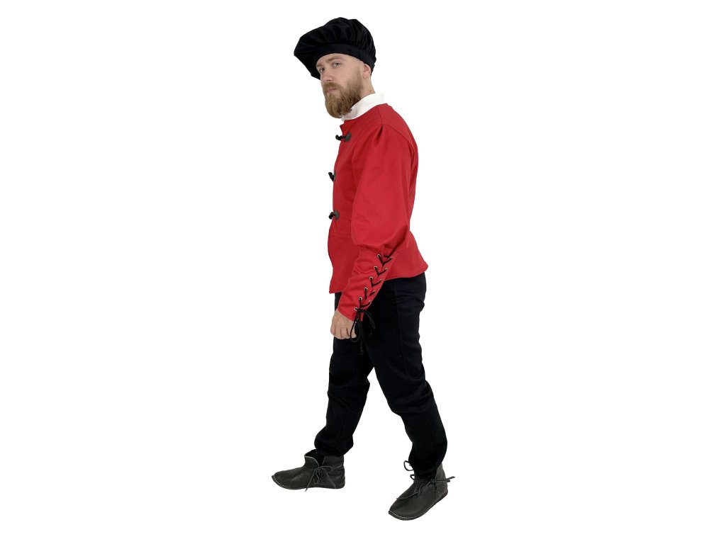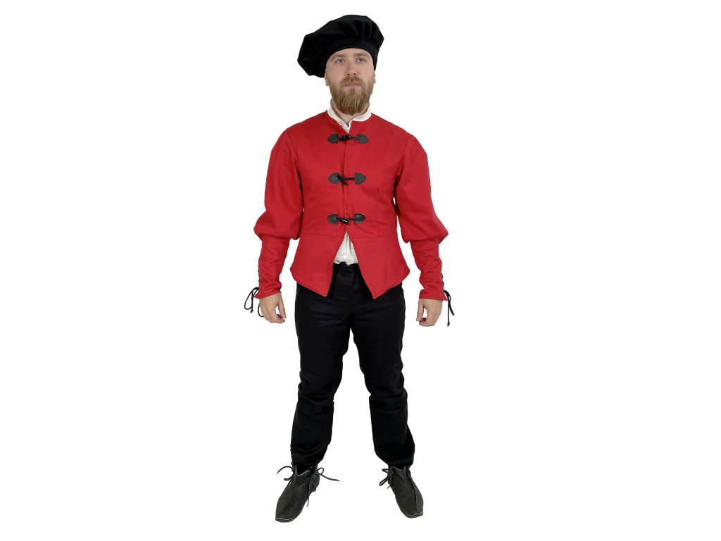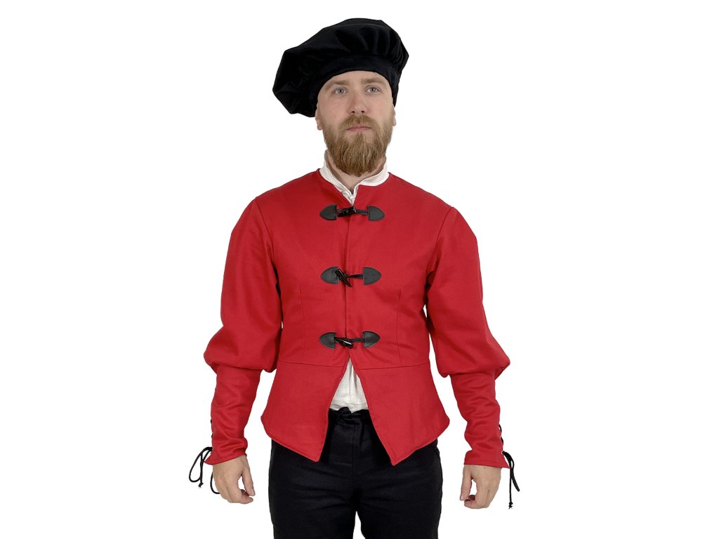 Dublet pro měšťany – Raffael je poctivě zpracovaný červený kabátec inspirovaný dobovým oděvem městského obyvatelstva pozdního středověku a raného novověku. Tento dublet vyrábíme výhradně v naší dílně – každý kus od základu navrhujeme s důrazem na detail a funkčnost. Základem je pevný kepr (plátnová bavlněná tkanina s jemnou strukturou), podšitý, a to pro větší pohodlí a lepší padnutí. Má elegantní, ale ne přehnaně okázalý střih, který vyhovuje postavám měšťanů, řemeslníků, písařů, cechovních mistrů nebo postav z bohatších vrstev nižší šlechty. Díky praktickému zapínání vpředu, pevnému provedení a neutrální červené barvě je dublet ideální pro kombinaci s dalšími vrstvami oděvu. Hodí se na historické slavnosti, larpové bitvy, fantasy akce, jako divadelní kostým a k dalším příležitostem.